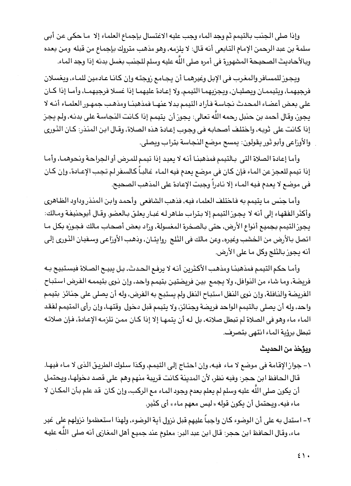 1 - جواز الإقامة في موضع لا ماء فيه، وإن احتاج إلى التيمم، وكذا سلوك الطريق الذي لا ماء فيها. قال الحافظ ابن حجر: وفيه نظر، لأن المدينة كانت قريبة منهم وهم على قصد دخولها، ويحتمل أن يكون صلى الله عليه وسلم لم يعلم بعدم وجود الماء مع الركب، وإن كان قد علم بأن المكان لا ماء فيه، ويحتمل أن يكون قوله "ليس معهم ماء" أي كثير.