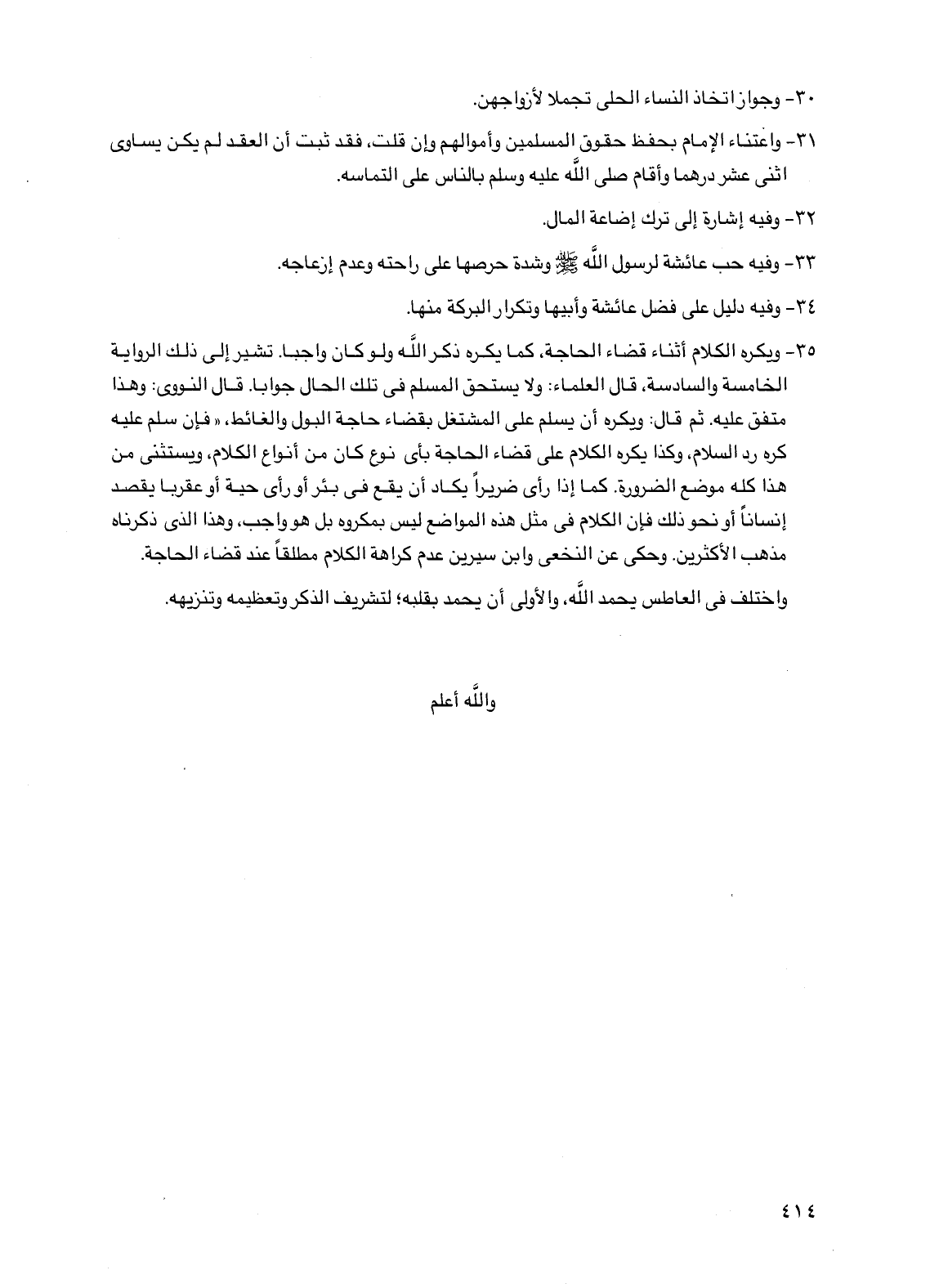 35 - ويكره الكلام أثناء قضاء الحاجة، كما يكره ذكر الله ولو كان واجبا. تشير إلى ذلك الرواية الخامسة والسادسة، قال العلماء: ولا يستحق المسلم في تلك الحال جوابا. قال النووي: وهذا متفق عليه. ثم قال: ويكره أن يسلم على المشتغل بقضاء حاجة البول والغائط، "فإن سلم عليه كره رد السلام، وكذا يكره الكلام على قضاء الحاجة بأي نوع كان من أنواع الكلام، ويستثنى من هذا كله موضع الضرورة. كما إذا رأى ضريرا يكاد أن يقع في بئر أو رأى حية أو عقربا يقصد إنسانا أو نحو ذلك فإن الكلام في مثل هذه المواضع ليس بمكروه بل هو واجب، وهذا الذي ذكرناه مذهب الأكثرين. وحكي عن النخعي وابن سيرين عدم كراهة الكلام مطلقا عند قضاء الحاجة.