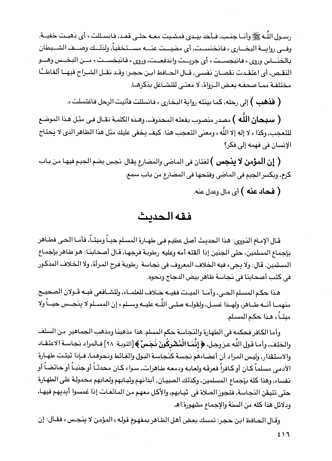 (إن المؤمن لا ينجس) لغتان في الماضي والمضارع يقال نجس بضم الجيم فيها من باب كرم، وبكسر الجيم في الماضي وفتحها في المضارع من باب سمع.