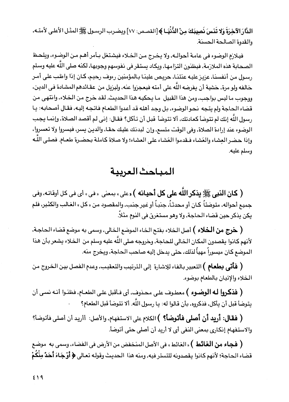 فيلازم الوضوء في عامة أحواله، ولا يخرج من الخلاء فيشتغل بأمر أهم من الوضوء، ويلحظ الصحابة هذه الملازمة، فيظنون التزامها، ويكاد يستقر في نفوسهم وجوبها، لكنه صلى الله عليه وسلم رسول من أنفسنا، عزيز عليه عنتنا، حريص علينا بالمؤمنين رءوف رحيم، كان إذا واظب على أمر خالفه ولو مرة، خشية أن يفرضه الله على أمته فيعجزوا عنه، وليزيل من عقائدهم المشادة في الدين، ووجوب ما ليس بواجب، ومن هذا القبيل ما يحكيه هذا الحديث. لقد خرج من الخلاء، وانتهى من قضاء الحاجة ولم يتجه نحو الوضوء، بل وجد أهله قد أعدوا الطعام فاتجه إليه، فقال أصحابه: يا رسول الله إنك لم تتوضأ كعادتك، ألا تتوضأ قبل أن تأكل؟ فقال: إني لم أقصد الصلاة، وإنما يجب الوضوء عند إرادة الصلاة، وفي الوقت متسع، وإن لبدنك عليك حقا، والدين يسر، فيسروا ولا تعسروا، وإذا حضر العشاء والعشاء فقدموا العشاء على العشاء؛ ولا صلاة كاملة بحضرة طعام. فصلى الله وسلم عليه.
