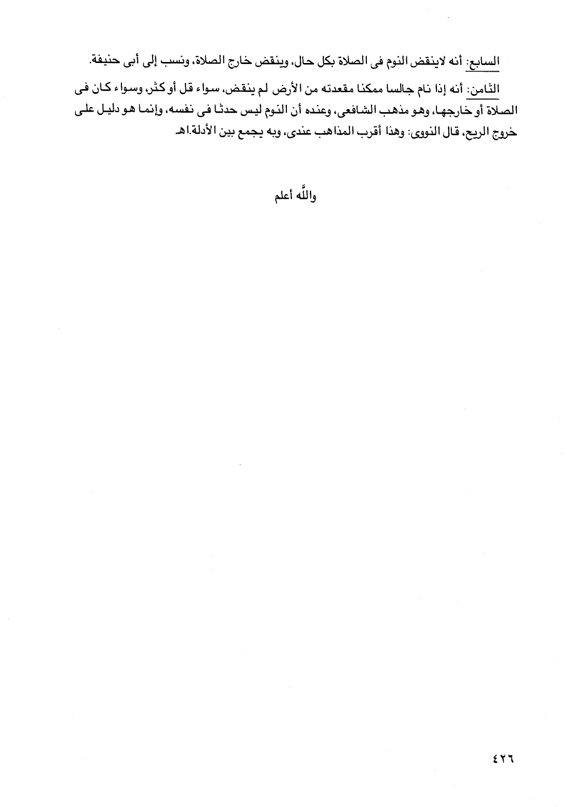 الثامن: أنه إذا نام جالسا ممكنا مقعدته من الأرض لم ينقض، سواء قل أو كثر، وسواء كان في الصلاة أو خارجها، وهو مذهب الشافعي، وعنده أن النوم ليس حدثا في نفسه، وإنما هو دليل على خروج الريح، قال النووي: وهذا أقرب المذاهب عندي، وبه يجمع بين الأدلة. اهـ.