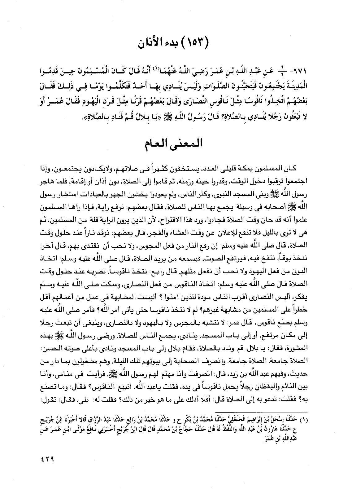 671 - عن عبد الله بن عمر رضي الله عنهما أنه قال كان المسلمون حين قدموا المدينة يجتمعون فيتحينون الصلوات وليس ينادي بها أحد فتكلموا يوما في ذلك فقال بعضهم اتخذوا ناقوسا مثل ناقوس النصارى وقال بعضهم قرنا مثل قرن اليهود فقال عمر أو لا تبعثون رجلا ينادي بالصلاة؟ قال رسول الله صلى الله عليه وسلم "يا بلال قم فناد بالصلاة".