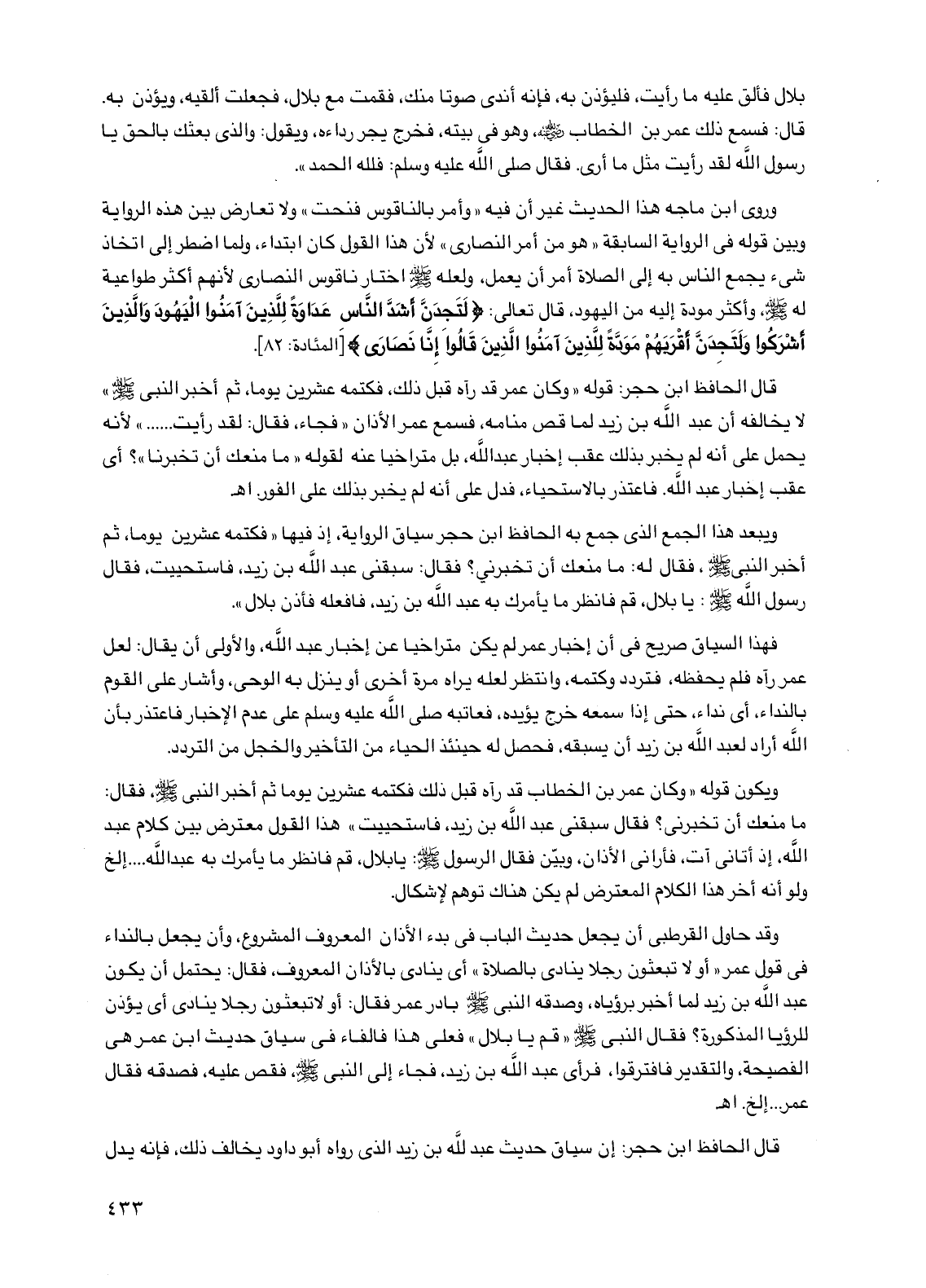 ويبعد هذا الجمع الذي جمع به الحافظ ابن حجر سياق الرواية، إذ فيها "فكتمه عشرين يوما، ثم أخبر النبي صلى الله عليه وسلم، فقال له: ما منعك أن تخبرني؟ فقال: سبقني عبد الله بن زيد، فاستحييت، فقال رسول الله صلى الله عليه وسلم: يا بلال، قم فانظر ما يأمرك به عبد الله بن زيد، فافعله فأذن بلال".