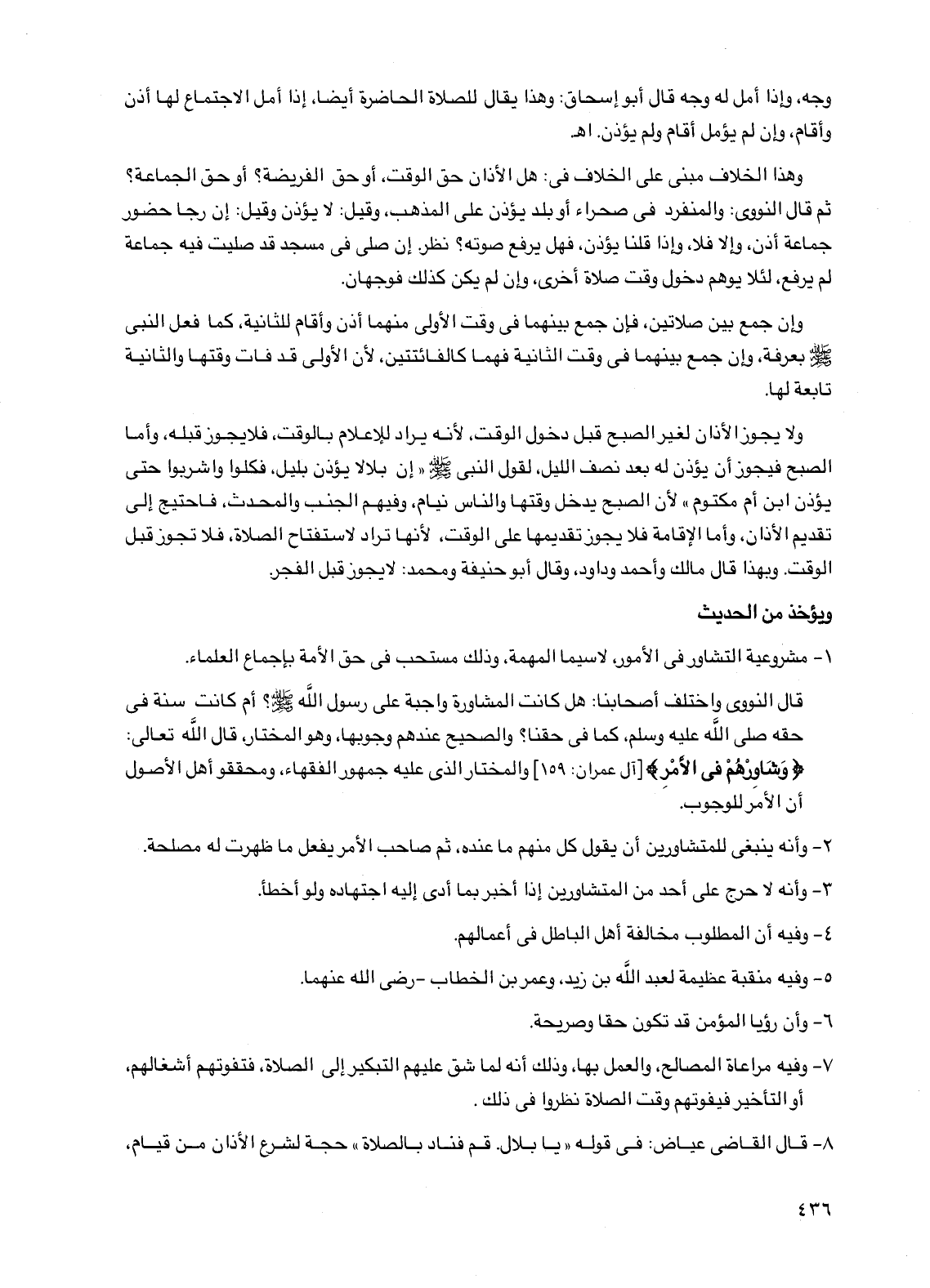 قال النووي واختلف أصحابنا: هل كانت المشاورة واجبة على رسول الله صلى الله عليه وسلم؟ أم كانت سنة في حقه صلى الله عليه وسلم، كما في حقنا؟ والصحيح عندهم وجوبها، وهو المختار، قال الله تعالى: {وشاورهم في الأمر} [آل عمران: 159] والمختار الذي عليه جمهور الفقهاء، ومحققو أهل الأصول أن الأمر للوجوب.