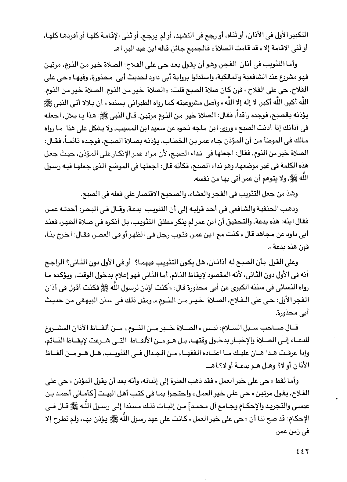 قال صاحب سبل السلام: ليس "الصلاة خير من النوم" من ألفاظ الأذان المشروع للدعاء إلى الصلاة والإخبار بدخول وقتها، بل هو من الألفاظ التي شرعت لإيقاظ النائم، وإذا عرفت هذا هان عليك ما اعتاده الفقهاء من الجدال في التثويب، هل هو من ألفاظ الأذان أو لا؟ وهل هو بدعة أو لا؟ . اهـ.