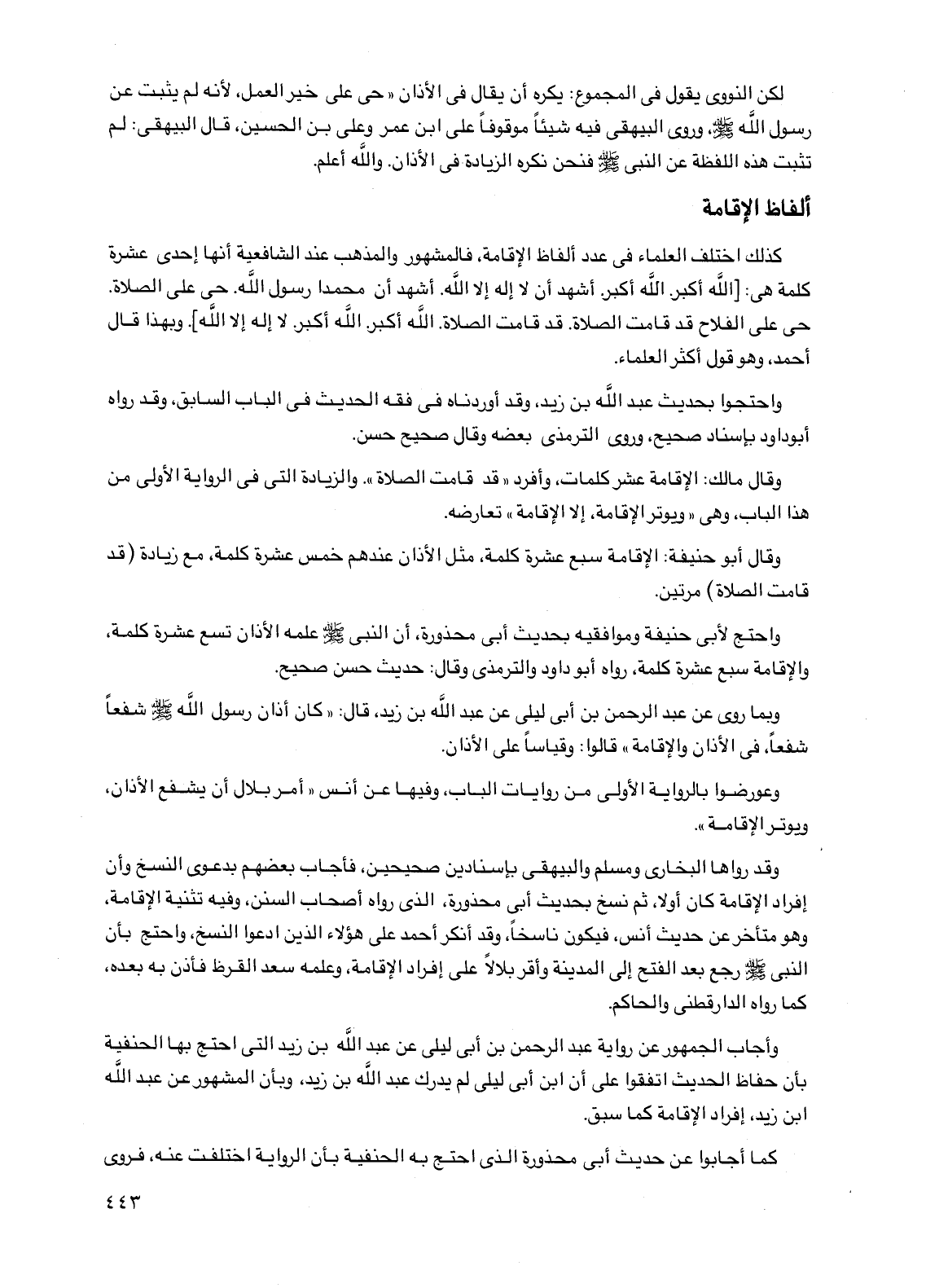 وأجاب الجمهور عن رواية عبد الرحمن بن أبي ليلى عن عبد الله بن زيد التي احتج بها الحنفية بأن حفاظ الحديث اتفقوا على أن ابن أبي ليلى لم يدرك عبد الله بن زيد، وبأن المشهور عن عبد الله بن زيد، إفراد الإقامة كما سبق.