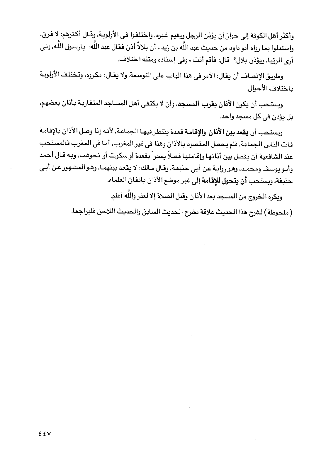 ويستحب أن يكون الأذان بقرب المسجد، وأن لا يكتفي أهل المساجد المتقاربة بأذان بعضهم، بل يؤذن في كل مسجد واحد.
