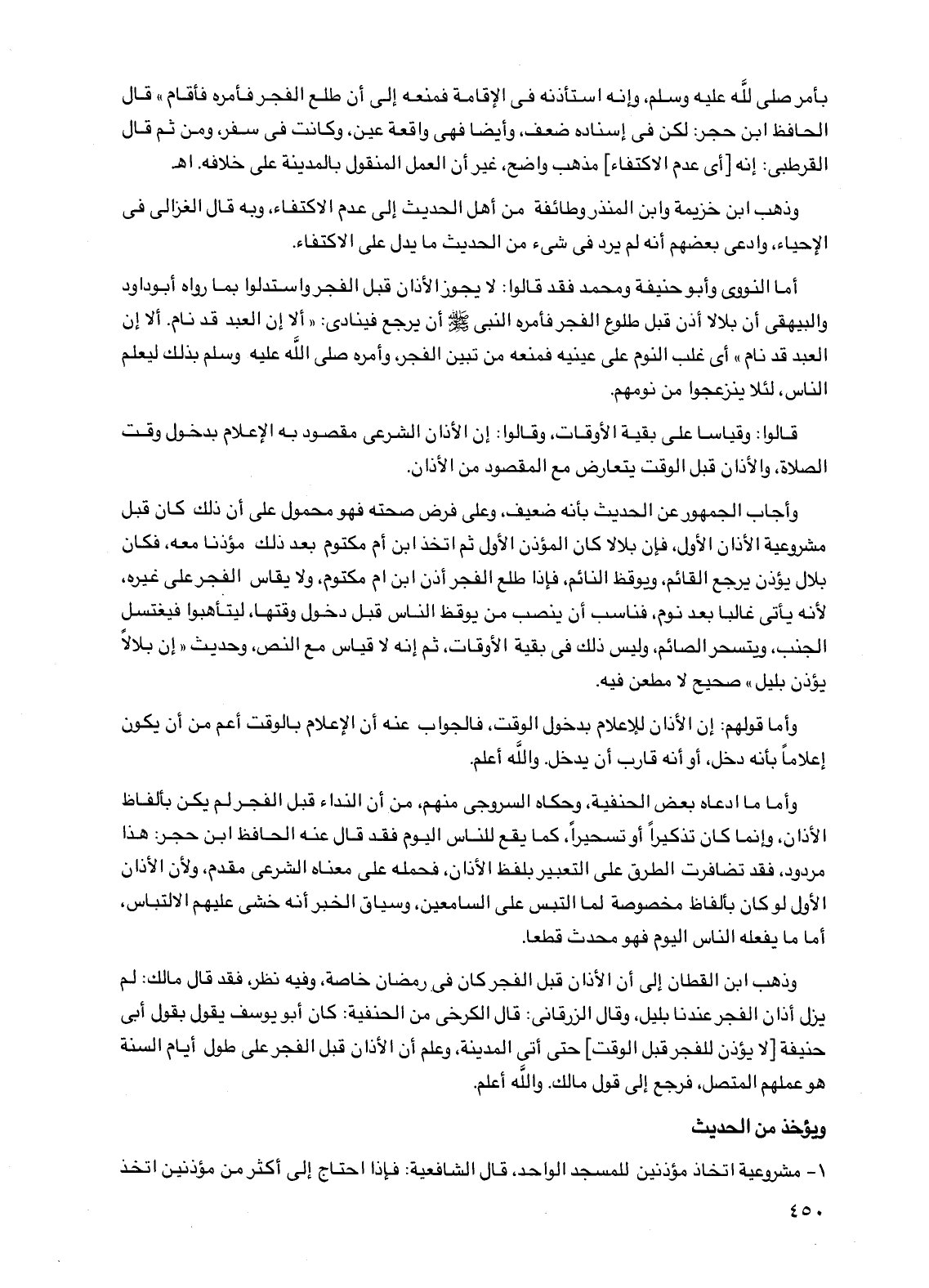 وأجاب الجمهور عن الحديث بأنه ضعيف، وعلى فرض صحته فهو محمول على أن ذلك كان قبل مشروعية الأذان الأول، فإن بلالا كان المؤذن الأول ثم اتخذ ابن أم مكتوم بعد ذلك مؤذنا معه، فكان بلال يؤذن يرجع القائم، ويوقظ النائم، فإذا طلع الفجر أذن ابن أم مكتوم، ولا يقاس الفجر على غيره، لأنه يأتي غالبا بعد نوم، فناسب أن ينصب من يوقظ الناس قبل دخول وقتها، ليتأهبوا فيغتسل الجنب، ويتسحر الصائم، وليس ذلك في بقية الأوقات، ثم إنه لا قياس مع النص، وحديث "إن بلالا يؤذن بليل" صحيح لا مطعن فيه.