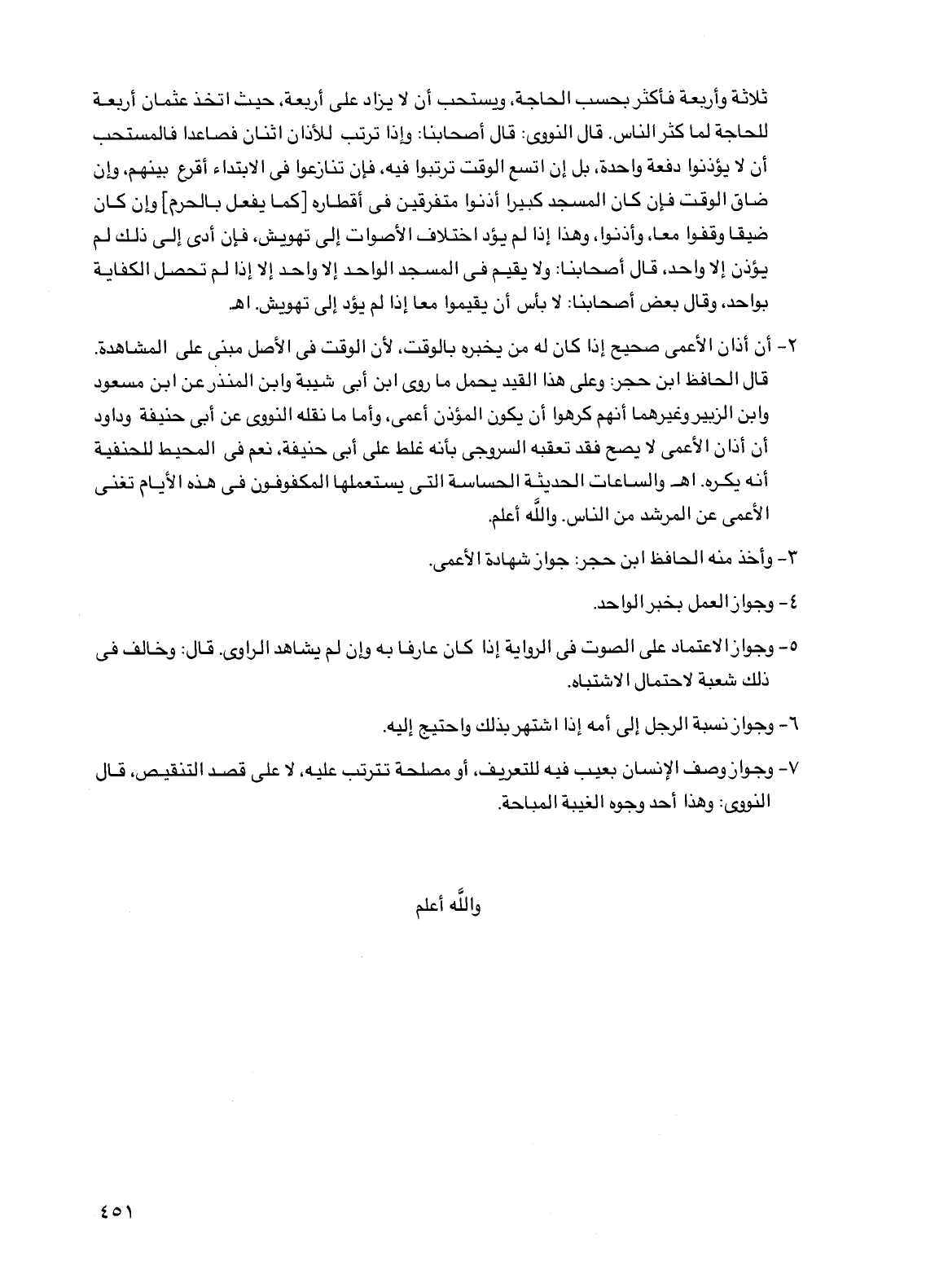 2 - أن أذان الأعمى صحيح إذا كان له من يخبره بالوقت، لأن الوقت في الأصل مبني على المشاهدة. قال الحافظ ابن حجر: وعلى هذا القيد يحمل ما روى ابن أبي شيبة وابن المنذر عن ابن مسعود وابن الزبير وغيرهما أنهم كرهوا أن يكون المؤذن أعمى، وأما ما نقله النووي عن أبي حنيفة وداود أن أذان الأعمى لا يصح فقد تعقبه السروجي بأنه غلط على أبي حنيفة، نعم في المحيط للحنفية أنه يكره. اهـ والساعات الحديثة الحساسة التي يستعملها المكفوفون في هذه الأيام تغني الأعمى عن المرشد من الناس. والله أعلم.