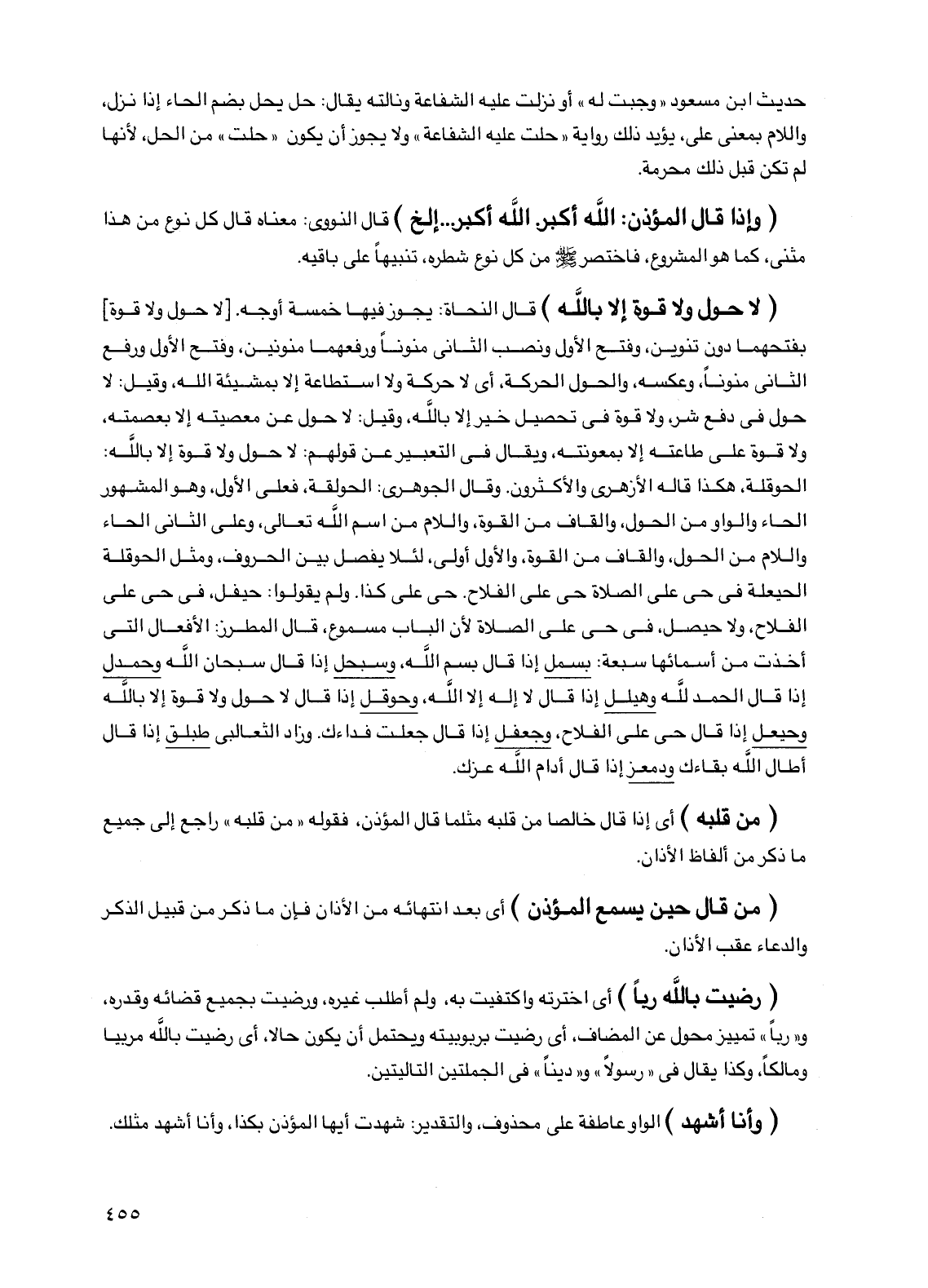 (لا حول ولا قوة إلا بالله) قال النحاة: يجوز فيها خمسة أوجه. [لا حول ولا قوة] بفتحهما دون تنوين، وفتح الأول ونصب الثاني منونا ورفعهما منونين، وفتح الأول ورفع الثاني منونا، وعكسه، والحول الحركة، أي لا حركة ولا استطاعة إلا بمشيئة الله، وقيل: لا حول في دفع شر، ولا قوة في تحصيل خير إلا بالله، وقيل: لا حول عن معصيته إلا بعصمته، ولا قوة على طاعته إلا بمعونته، ويقال في التعبير عن قولهم: لا حول ولا قوة إلا بالله: الحوقلة، هكذا قاله الأزهري والأكثرون. وقال الجوهري: الحولقة، فعلى الأول، وهو المشهور الحاء والواو من الحول، والقاف من القوة، واللام من اسم الله تعالى، وعلى الثاني الحاء واللام من الحول، والقاف من القوة، والأول أولى، لئلا يفصل بين الحروف، ومثل الحوقلة الحيعلة في حي على الصلاة حي على الفلاح. حي على كذا. ولم يقولوا: حيفل، في حي على الفلاح، ولا حيصل، في حي على الصلاة لأن الباب مسموع، قال المطرز: الأفعال التي أخذت من أسمائها سبعة: بسمل إذا قال بسم الله، وسبحل إذا قال سبحان الله وحمدل إذا قال الحمد لله وهيلل إذا قال لا إله إلا الله، وحوقل إذا قال لا حول ولا قوة إلا بالله وحيعل إذا قال حي على الفلاح، وجعفل إذا قال جعلت فداءك. وزاد الثعالبي طبلق إذا قال أطال الله بقاءك ودمعز إذا قال أدام الله عزك.