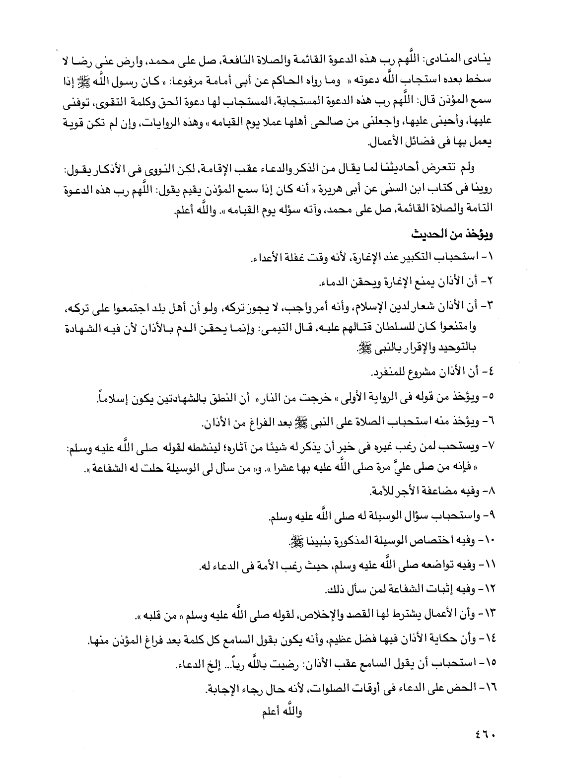 14 - وأن حكاية الأذان فيها فضل عظيم، وأنه يكون بقول السامع كل كلمة بعد فراغ المؤذن منها.