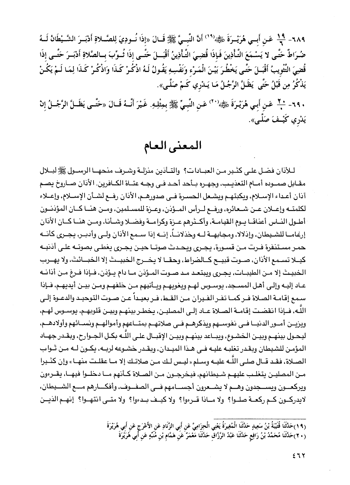 689 - عن أبي هريرة رضي الله عنه أن النبي صلى الله عليه وسلم قال "إذا نودي للصلاة أدبر الشيطان له ضراط حتى لا يسمع التأذين فإذا قضي التأذين أقبل حتى إذا ثوب بالصلاة أدبر حتى إذا قضي التثويب أقبل حتى يخطر بين المرء ونفسه يقول له اذكر كذا واذكر كذا لما لم يكن يذكر من قبل حتى يظل الرجل ما يدري كم صلى".