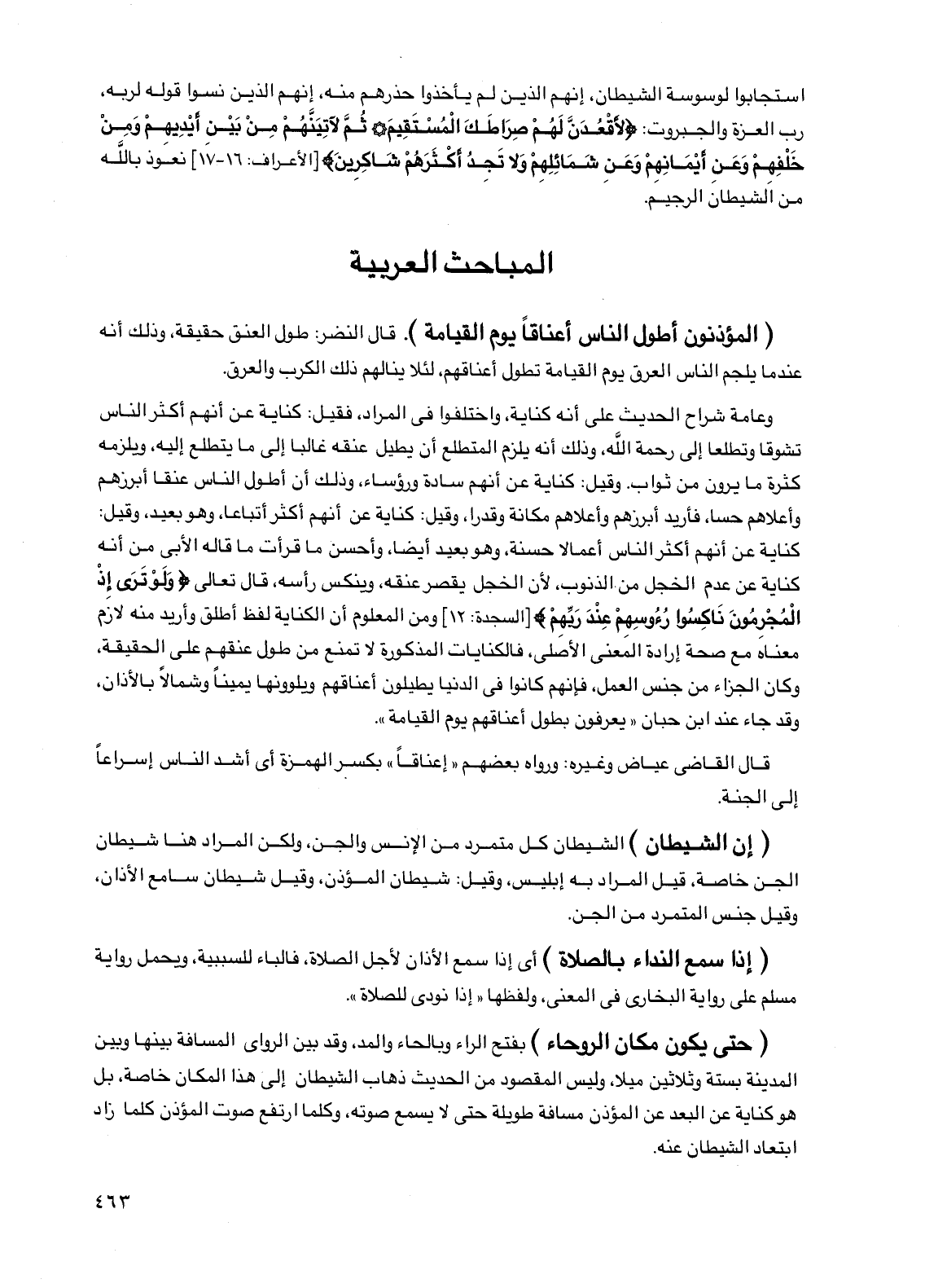 (المؤذنون أطول الناس أعناقا يوم القيامة) قال النضر: طول العنق حقيقة، وذلك أنه عندما يلجم الناس العرق يوم القيامة تطول أعناقهم، لئلا ينالهم ذلك الكرب والعرق.
