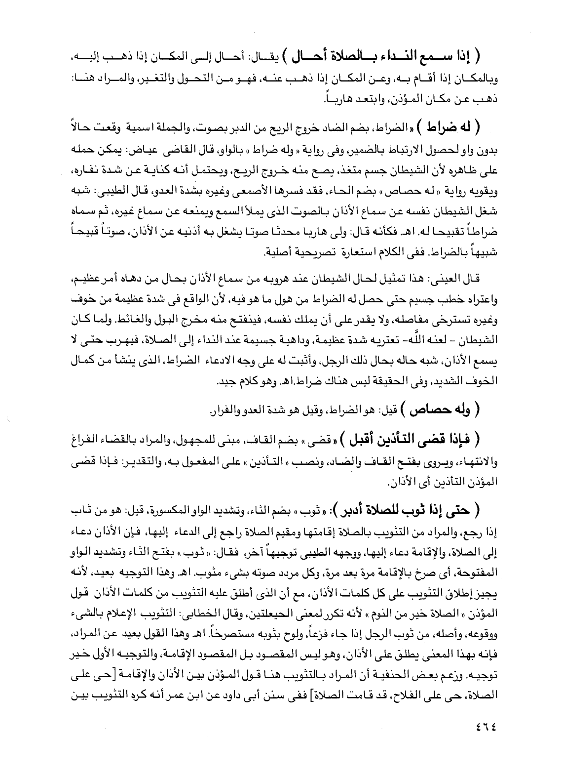 (له ضراط) "الضراط، بضم الضاد خروج الريح من الدبر بصوت، والجملة إسمية وقعت حالا بدون واو لحصول الارتباط بالضمير، وفي رواية "وله ضراط" بالواو، قال القاضي عياض: يمكن حمله على ظاهره لأن الشيطان جسم متغذ، يصح منه خروج الريح، ويحتمل أنه كناية عن شدة نفاره، ويقويه رواية "له حصاص" بضم الحاء، فقد فسرها الأصمعي وغيره بشدة العدو، قال الطيبي: شبه شغل الشيطان نفسه عن سماع الأذان بالصوت الذي يملأ السمع ويمنعه عن سماع غيره، ثم سماه ضراطا تقبيحا له. اهـ. فكأنه قال: ولى هاربا محدثا صوتا يشغل به أذنيه عن الأذان، صوتا قبيحا شبيها بالضراط. ففي الكلام استعارة تصريحية أصلية.