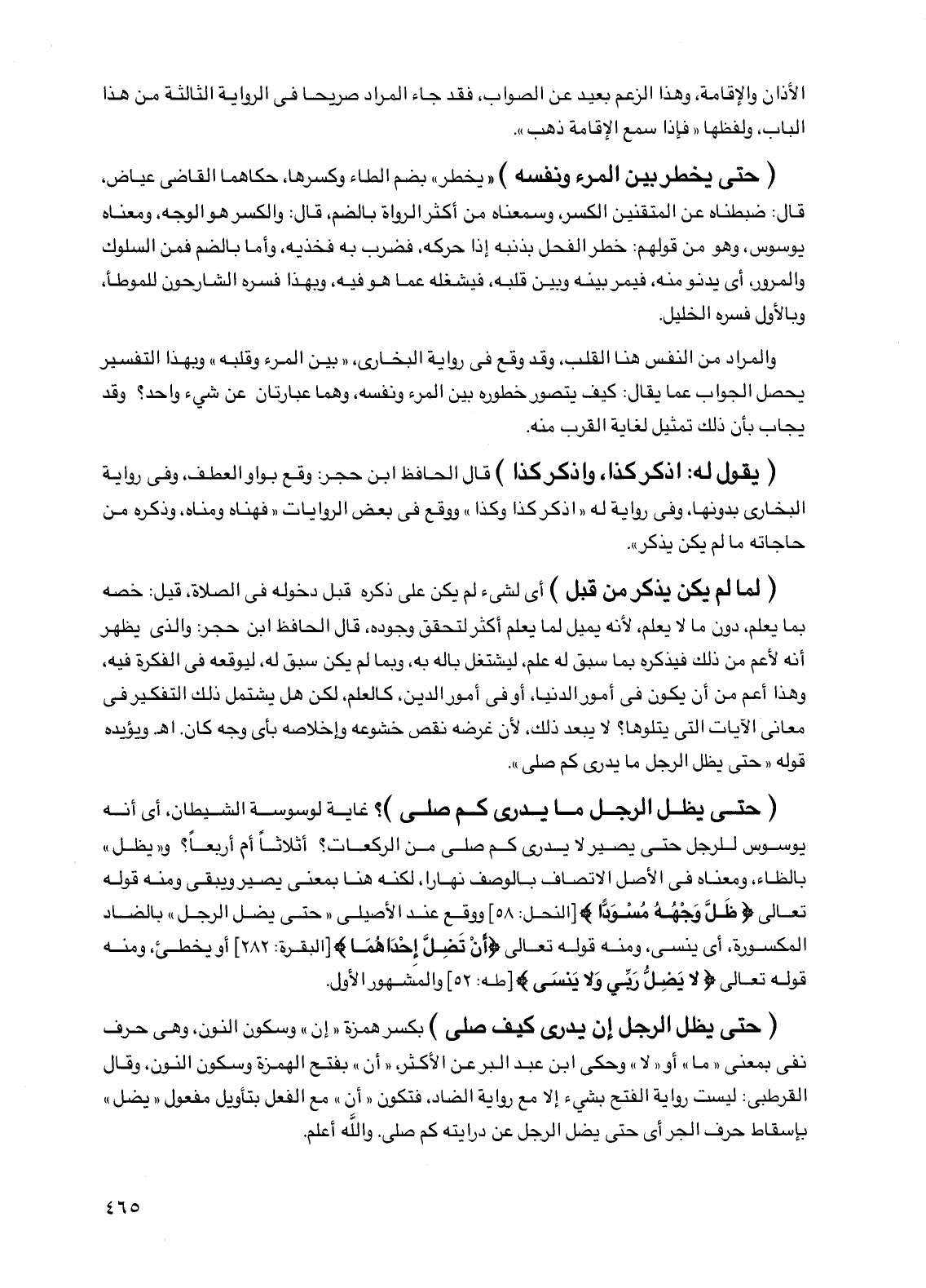 (حتى يظل الرجل ما يدري كم صلى)؟ غاية لوسوسة الشيطان، أي أنه يوسوس للرجل حتى يصير لا يدري كم صلى من الركعات؟ أثلاثا أم أربعا؟ و"يظل" بالظاء، ومعناه في الأصل الاتصاف بالوصف نهارا، لكنه هنا بمعنى يصير ويبقى ومنه قوله تعالى {ظل وجهه مسودا} [النحل: 58] ووقع عند الأصيلي "حتى يضل الرجل" بالضاد المكسورة، أي ينسى، ومنه قوله تعالى {أن تضل إحداهما} [البقرة: 282] أو يخطئ، ومنه قوله تعالى {لا يضل ربي ولا ينسى} [طه: 52] والمشهور الأول.