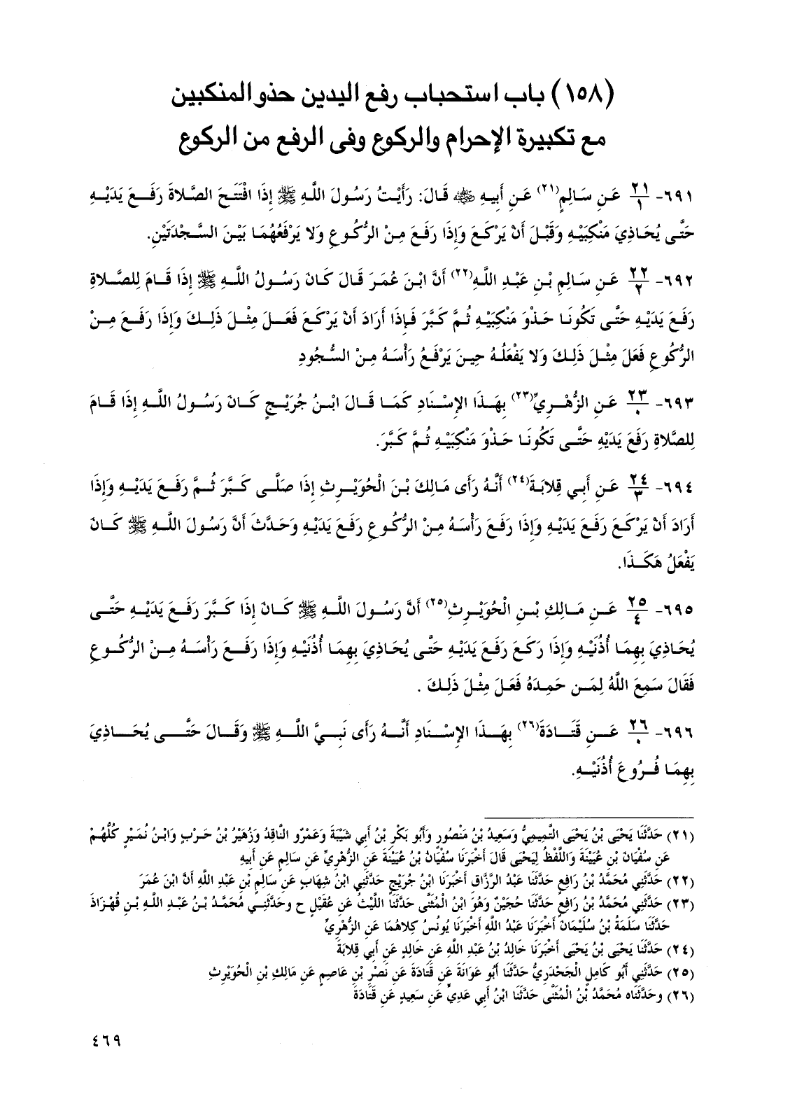 691 - عن سالم عن أبيه رضي الله عنه قال: رأيت رسول الله صلى الله عليه وسلم إذا افتتح الصلاة رفع يديه حتى يحاذي منكبيه وقبل أن يركع وإذا رفع من الركوع ولا يرفعهما بين السجدتين.