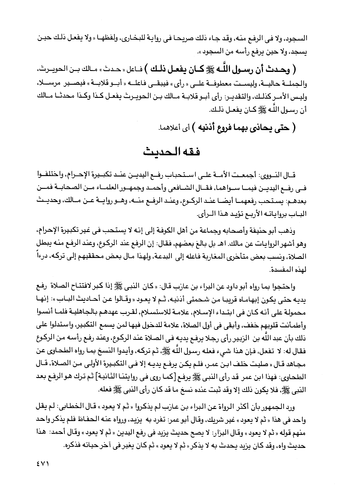 واحتجوا بما رواه أبو داود عن البراء بن عازب قال: "كان النبي صلى الله عليه وسلم إذا كبر لافتتاح الصلاة رفع يديه حتى يكون إبهاماه قريبا من شحمتي أذنيه، ثم لا يعود "وقالوا عن أحاديث الباب": إنها محمولة على أنه كان في ابتداء الإسلام، علامة للاستسلام، لقرب عهدهم بالجاهلية فلما أنسوا واطمأنت قلوبهم خفف، وأبقى في أول الصلاة، علامة للدخول فيها لمن يسمع التكبير، واستدلوا على ذلك بأن عبد الله بن الزبير رأى رجلا يرفع يديه في الصلاة عند الركوع، وعند رفع رأسه من الركوع فقال له: لا تفعل، فإن هذا شيء فعله رسول الله صلى الله عليه وسلم ثم تركه، وأيدوا النسخ بما رواه الطحاوي عن مجاهد قال "صليت خلف ابن عمر، فلم يكن يرفع يديه إلا في التكبيرة الأولى من الصلاة، قال الطحاوي: فهذا ابن عمر قد رأى النبي صلى الله عليه وسلم يرفع [كما روي في روايتنا الثانية] ثم ترك هو الرفع بعد النبي صلى الله عليه وسلم، فلا يكون ذلك إلا وقد ثبت عنده نسخ ما قد كان رأى النبي صلى الله عليه وسلم فعله.