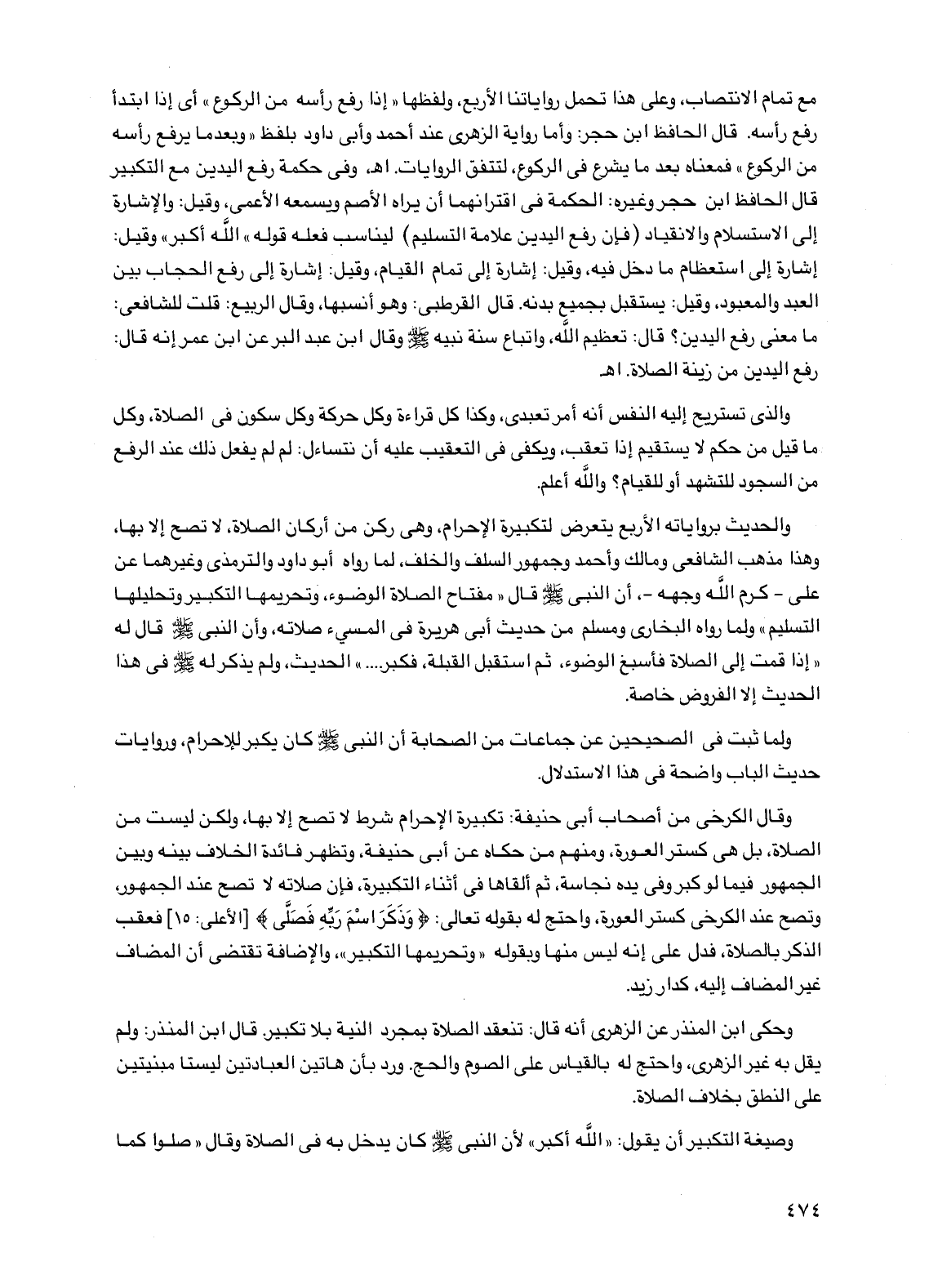 مع تمام الانتصاب، وعلى هذا تحمل رواياتنا الأربع، ولفظها "إذا رفع رأسه من الركوع" أي إذا ابتدأ رفع رأسه. قال الحافظ ابن حجر: وأما رواية الزهري عند أحمد وأبي داود بلفظ "وبعد ما يرفع رأسه من الركوع" فمعناه بعد ما يشرع في الركوع، لتتفق الروايات. اهـ. وفي حكمة رفع اليدين مع التكبير قال الحافظ ابن حجر وغيره: الحكمة في اقترانهما أن يراه الأصم ويسمعه الأعمى، وقيل: والإشارة إلى الاستسلام والانقياد (فإن رفع اليدين علامة التسليم) ليناسب فعله قوله "الله أكبر" وقيل: إشارة إلى استعظام ما دخل فيه، وقيل: إشارة إلى تمام القيام، وقيل: إشارة إلى رفع الحجاب بين العبد والمعبود، وقيل: يستقبل بجميع بدنه. قال القرطبي: وهو أنسبها، وقال الربيع: قلت للشافعي: ما معنى رفع اليدين؟ قال: تعظيم الله، واتباع سنة نبيه صلى الله عليه وسلم وقال ابن عبد البر عن ابن عمر إنه قال: رفع اليدين من زينة الصلاة. اهـ.