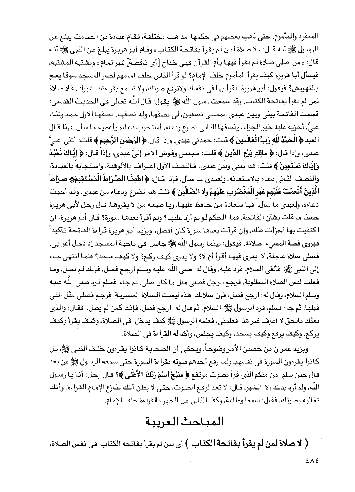 المنفرد والمأموم، حتى ذهب بعضهم في حكمها مذاهب مختلفة، فقام عبادة بن الصامت يبلغ عن الرسول صلى الله عليه وسلم أنه قال: "لا صلاة لمن لم يقرأ بفاتحة الكتاب" وقام أبو هريرة يبلغ عن النبي صلى الله عليه وسلم أنه قال: "من صلى صلاة لم يقرأ فيها بأم القرآن فهي خداج [أي ناقصة] غير تمام" ويشتبه المشتبه، فيسأل أبا هريرة كيف يقرأ المأموم خلف الإمام؟ لو قرأ الناس خلف إمامهم لصار المسجد سوقا يعج بالتهويش؟ فيقول: أبو هريرة: اقرأ بها في نفسك ولا ترفع صوتك، ولا تسمع بقراءتك غيرك، فلا صلاة لمن لم يقرأ بفاتحة الكتاب، وقد سمعت رسول الله صلى الله عليه وسلم يقول: قال الله تعالى في الحديث القدسي: قسمت الفاتحة بيني وبين عبدي المصلي نصفين، لي نصفها، وله نصفها، نصفها الأول حمد وثناء علي، أجزيه عليه خير الجزاء، ونصفها الثاني تضرع ودعاء، أستجيب دعاءه وأعطيه ما سأل، فإذا قال العبد {الحمد لله رب العالمين} قلت: حمدني عبدي.