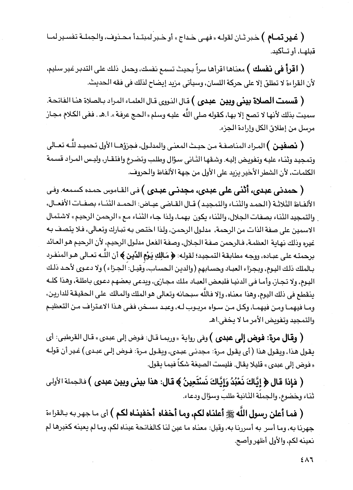(نصفين) المراد المناصفة من حيث المعنى والمدلول، فجزؤها الأول تحميد لله تعالى وتمجيد وثناء عليه وتفويض إليه. وشقها الثاني سؤال وطلب وتضرع وافتقار، وليس المراد قسمة الكلمات، لأن الشطر الأخير يزيد على الأول من جهة الألفاظ والحروف.
