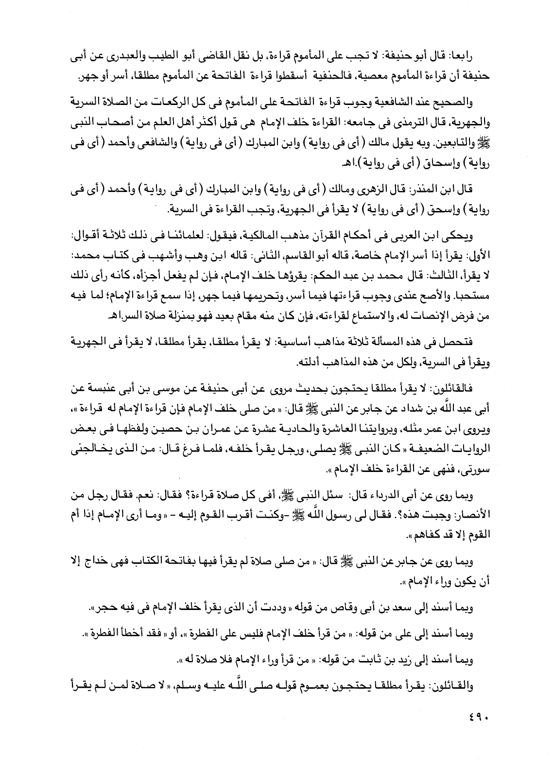 رابعا: قال أبو حنيفة: لا تجب على المأموم قراءة، بل نقل القاضي أبو الطيب والعبدري عن أبي حنيفة أن قراءة المأموم معصية، فالحنفية أسقطوا قراءة الفاتحة عن المأموم مطلقا، أسر أو جهر.