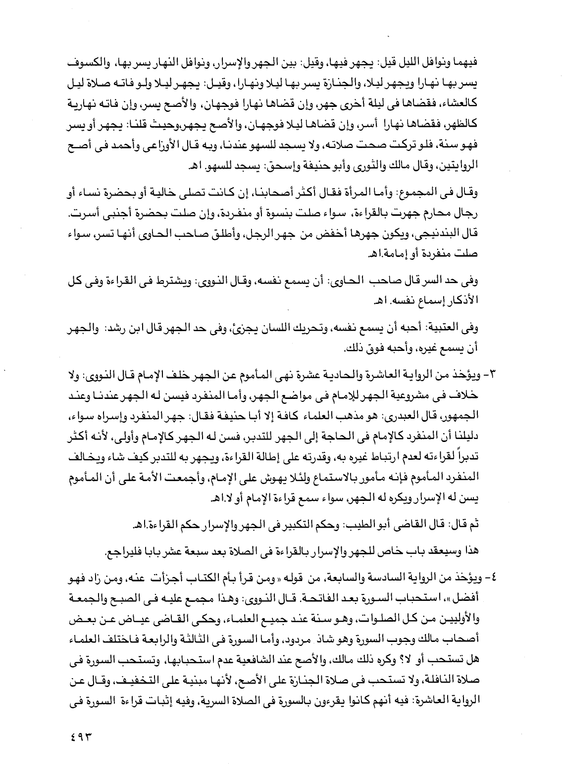 فيهما ونوافل الليل قيل: يجهر فيها، وقيل: بين الجهر والإسرار، ونوافل النهار يسر بها، والكسوف يسر بها نهارا ويجهر ليلا، والجنازة يسر بها ليلا ونهارا، وقيل: يجهر ليلا ولو فاته صلاة ليل كالعشاء، فقضاها في ليلة أخرى جهر، وإن قضاها نهارا فوجهان، والأصح يسر، وإن فاته نهارية كالظهر، فقضاها نهارا أسر، وإن قضاها ليلا فوجهان، والأصح يجهر، وحيث قلنا: يجهر أو يسر فهو سنة، فلو تركت صحت صلاته، ولا يسجد للسهو عندنا، وبه قال الأوزاعي وأحمد في أصح الروايتين، وقال مالك والثوري وأبو حنيفة وإسحق: يسجد للسهو. اهـ.