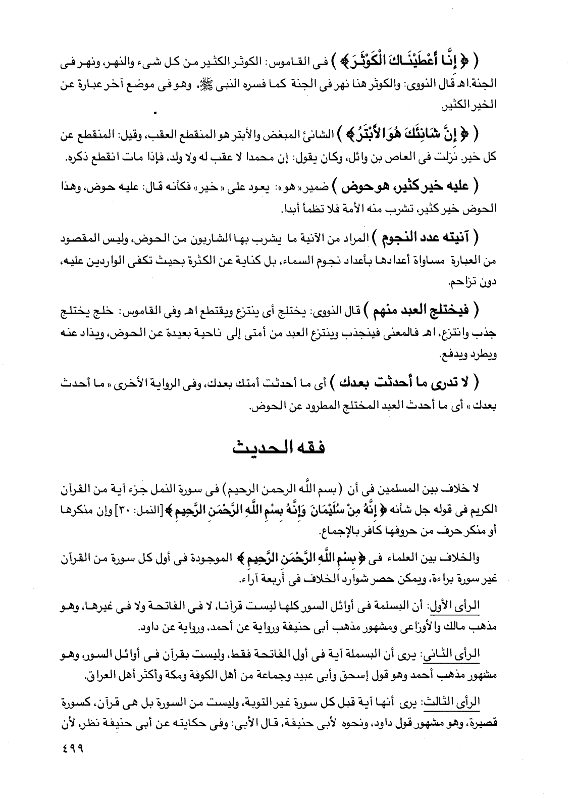 {إنا أعطيناك الكوثر} في القاموس: الكوثر الكثير من كل شيء والنهر، ونهر في الجنة. اهـ. قال النووي: والكوثر هنا نهر في الجنة كما فسره النبي صلى الله عليه وسلم، وهو في موضع آخر عبارة عن الخير الكثير.