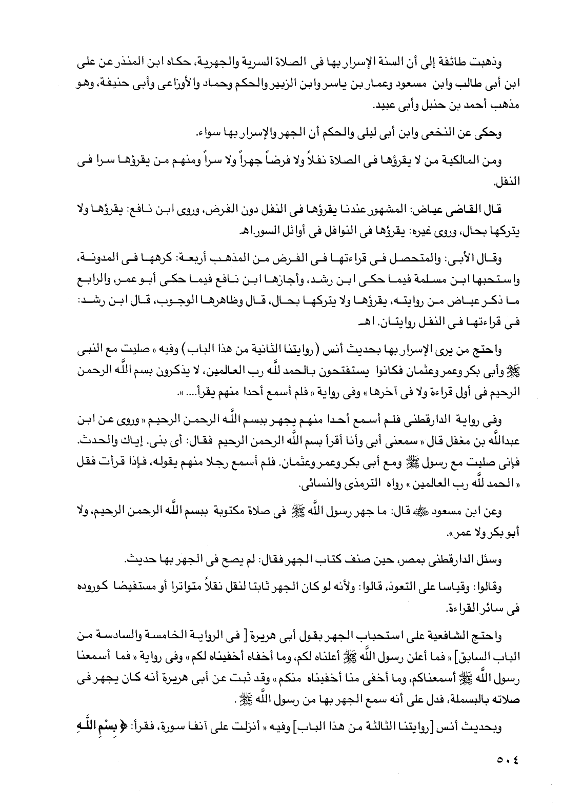 وفي رواية الدارقطني فلم أسمع أحدا منهم يجهر ببسم الله الرحمن الرحيم "وروي عن ابن عبد الله بن مغفل قال "سمعني أبي وأنا أقرأ بسم الله الرحمن الرحيم فقال: أي بني. إياك والحدث. فإني صليت مع رسول صلى الله عليه وسلم ومع أبي بكر وعمر وعثمان. فلم أسمع رجلا منهم يقوله، فإذا قرأت فقل "الحمد لله رب العالمين" رواه الترمذي والنسائي.