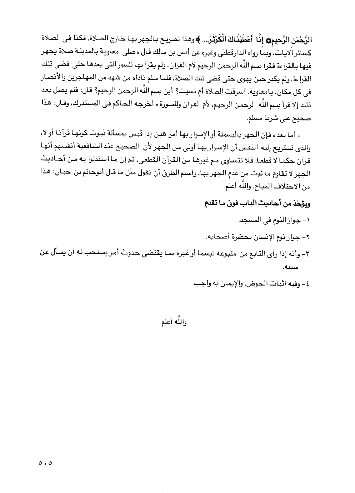 "أما بعد" فإن الجهر بالبسملة أو الإسرار بها أمر هين إذا قيس بمسألة ثبوت كونها قرآنا أو لا، والذي تستريح إليه النفس أن الإسرار بها أولى من الجهر لأن الصحيح عند الشافعية أنفسهم أنها قرآن حكما لا قطعا. فلا تتساوى مع غيرها من القرآن القطعي، ثم إن ما استدلوا به من أحاديث الجهر لا تقاوم ما ثبت من عدم الجهر بها، وأسلم الطرق أن نقول مثل ما قال أبو حاتم بن حبان: هذا من الاختلاف المباح. والله أعلم.