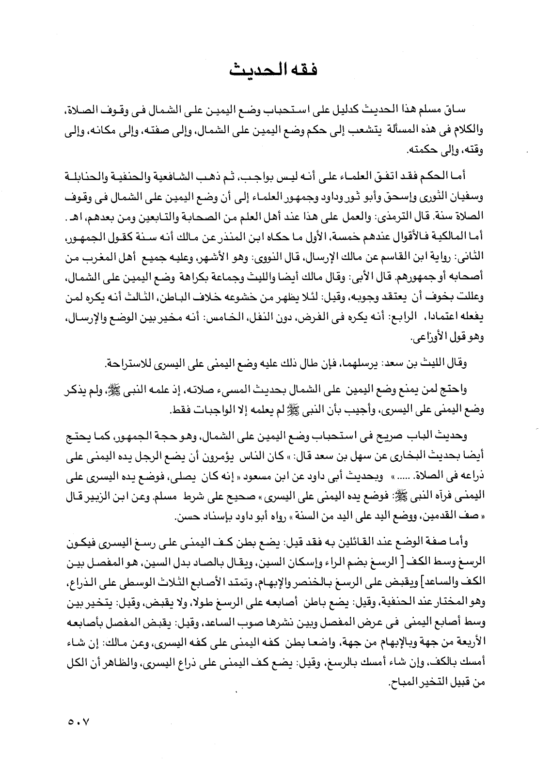 ساق مسلم هذا الحديث كدليل على استحباب وضع اليمين على الشمال في وقوف الصلاة، والكلام في هذه المسألة يتشعب إلى حكم وضع اليمين على الشمال، وإلى صفته، وإلى مكانه، وإلى وقته، وإلى حكمته.