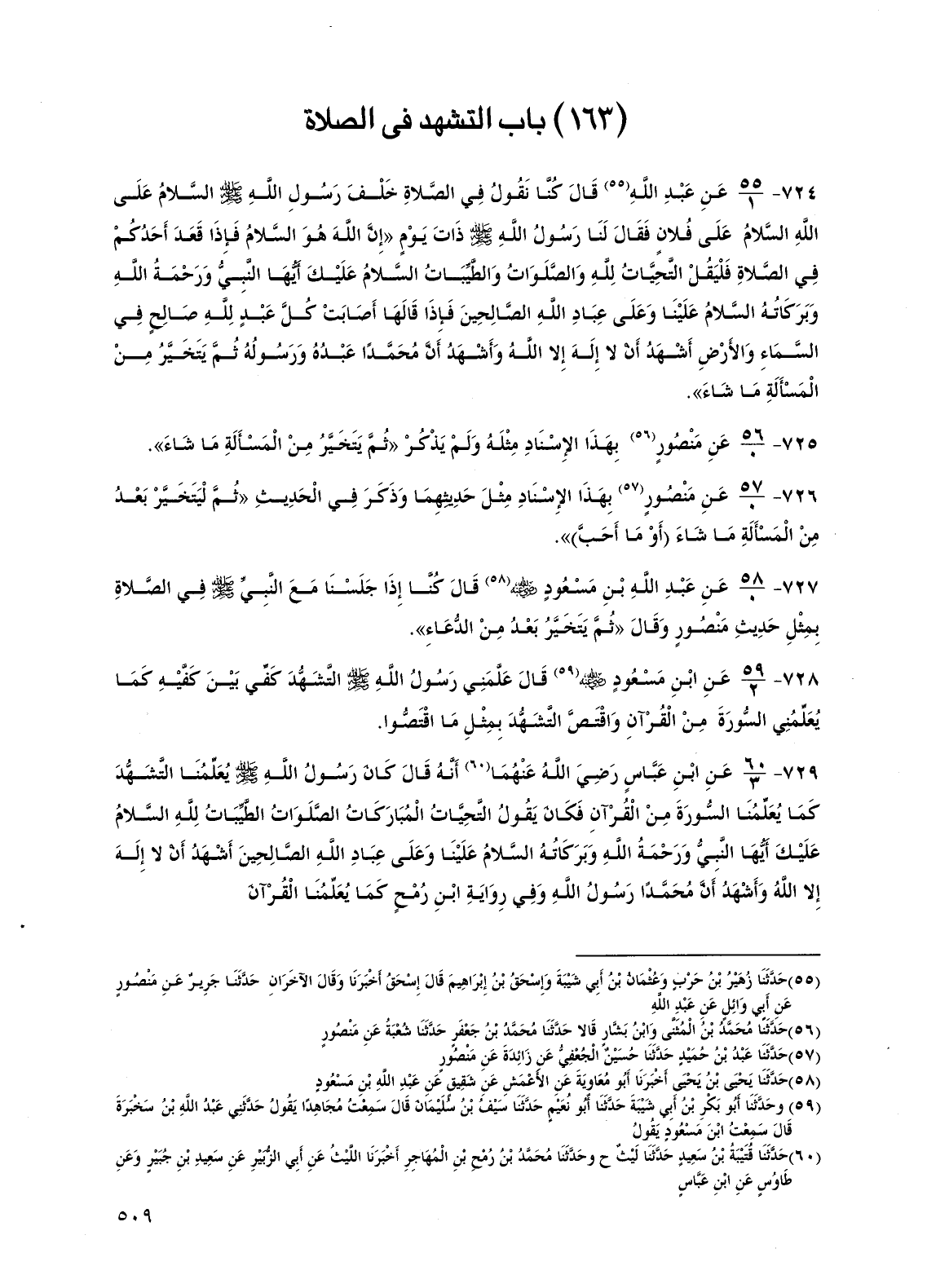 727 - عن عبد الله بن مسعود رضي الله عنه قال كنا إذا جلسنا مع النبي صلى الله عليه وسلم في الصلاة بمثل حديث منصور وقال "ثم يتخير بعد من الدعاء".