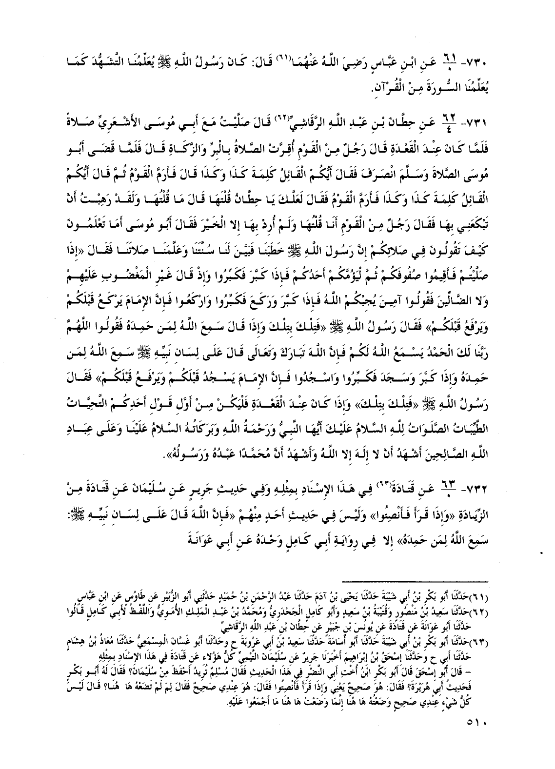 731 - عن حطان بن عبد الله الرقاشي قال صليت مع أبي موسى الأشعري صلاة فلما كان عند القعدة قال رجل من القوم أقرت الصلاة بالبر والزكاة قال فلما قضى أبو موسى الصلاة وسلم انصرف فقال أيكم القائل كلمة كذا وكذا قال فأرم القوم ثم قال أيكم القائل كلمة كذا وكذا فأرم القوم فقال لعلك يا حطان قلتها قال ما قلتها ولقد رهبت أن تبكعني بها فقال رجل من القوم أنا قلتها ولم أرد بها إلا الخير فقال أبو موسى أما تعلمون كيف تقولون في صلاتكم إن رسول الله صلى الله عليه وسلم خطبنا فبين لنا سنتنا وعلمنا صلاتنا فقال "إذا صليتم فأقيموا صفوفكم ثم ليؤمكم أحدكم فإذا كبر فكبروا وإذ قال غير المغضوب عليهم ولا الضالين فقولوا آمين يجبكم الله فإذا كبر وركع فكبروا واركعوا فإن الإمام يركع قبلكم ويرفع قبلكم" فقال رسول الله صلى الله عليه وسلم "فتلك بتلك وإذا قال سمع الله لمن حمده فقولوا اللهم ربنا لك الحمد يسمع الله لكم فإن الله تبارك وتعالى قال على لسان نبيه صلى الله عليه وسلم سمع الله لمن حمده وإذا كبر وسجد فكبروا واسجدوا فإن الإمام يسجد قبلكم ويرفع قبلكم" فقال رسول الله صلى الله عليه وسلم "فتلك بتلك" وإذا كان عند القعدة فليكن من أول قول أحدكم التحيات الطيبات الصلوات لله السلام عليك أيها النبي ورحمة الله وبركاته السلام علينا وعلى عباد الله الصالحين أشهد أن لا إله إلا الله وأشهد أن محمدا عبده ورسوله".