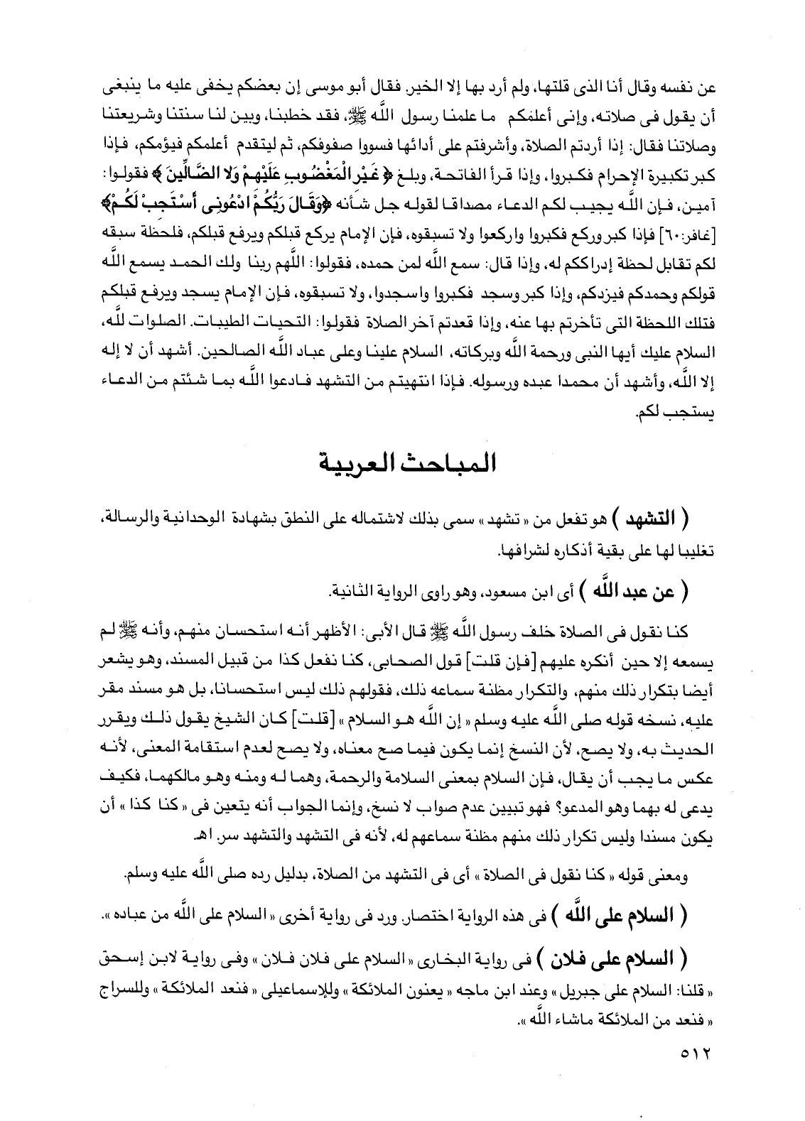 كنا نقول في الصلاة خلف رسول الله صلى الله عليه وسلم قال الأبي: الأظهر أنه استحسان منهم، وأنه صلى الله عليه وسلم لم يسمعه إلا حين أنكره عليهم [فإن قلت] قول الصحابي، كنا نفعل كذا من قبيل المسند، وهو يشعر أيضا بتكرار ذلك منهم، والتكرار مظنة سماعه ذلك، فقولهم ذلك ليس استحسانا، بل هو مسند مقر عليه، نسخه قوله صلى الله عليه وسلم "إن الله هو السلام" [قلت] كان الشيخ يقول ذلك ويقرر الحديث به، ولا يصح، لأن النسخ إنما يكون فيما صح معناه، ولا يصح لعدم استقامة المعنى، لأنه عكس ما يجب أن يقال، فإن السلام بمعنى السلامة والرحمة، وهما له ومنه وهو مالكهما، فكيف يدعي له بهما وهو المدعو؟ فهو تبيين عدم صواب لا نسخ، وإنما الجواب أنه يتعين في "كنا كذا" أن يكون مسندا وليس تكرار ذلك منهم مظنة سماعهم له، لأنه في التشهد والتشهد سر. اهـ.