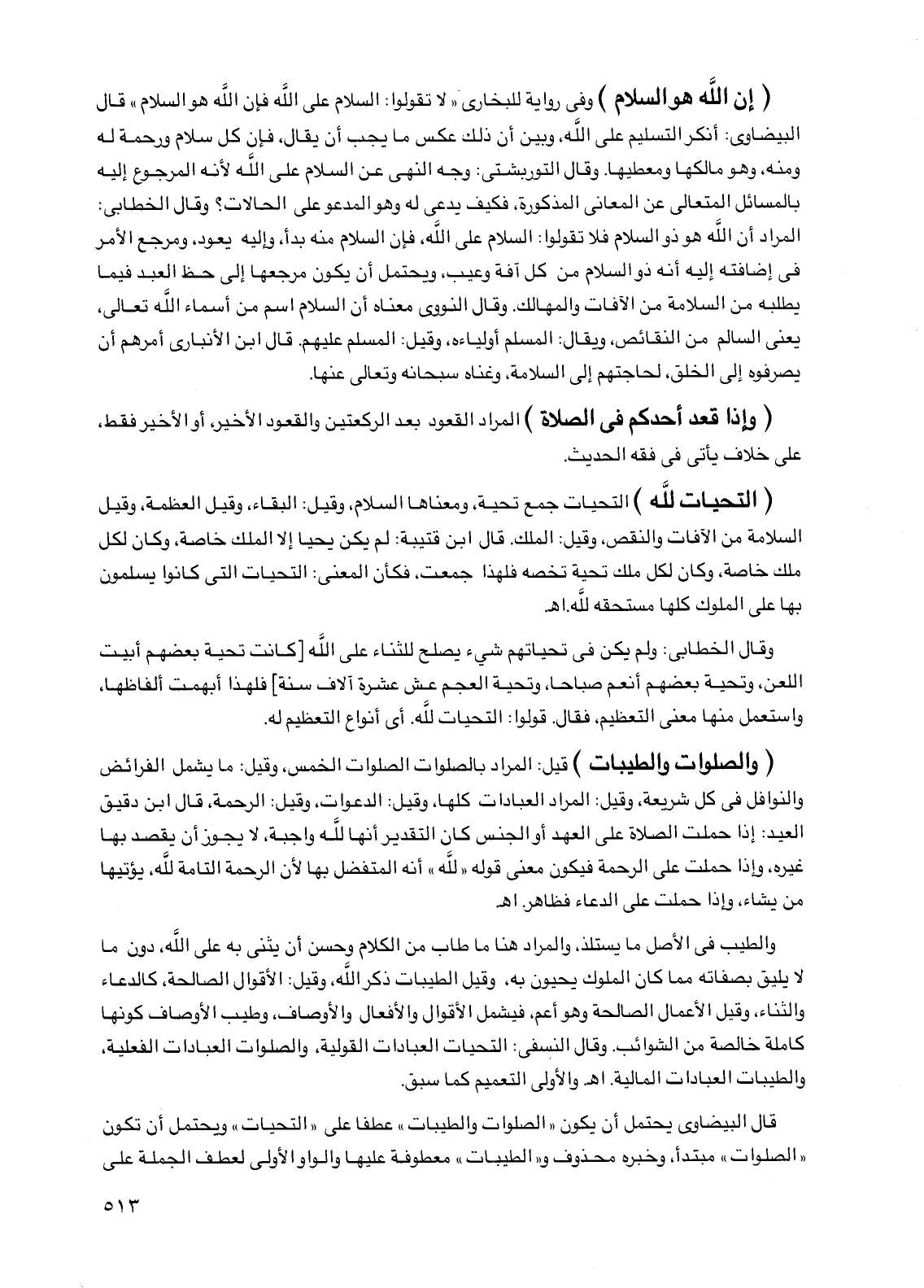 (والصلوات والطيبات) قيل: المراد بالصلوات الصلوات الخمس، وقيل: ما يشمل الفرائض والنوافل في كل شريعة، وقيل: المراد العبادات كلها، وقيل: الدعوات، وقيل: الرحمة، قال ابن دقيق العيد: إذا حملت الصلاة على العهد أو الجنس كان التقدير أنها لله واجبة، لا يجوز أن يقصد بها غيره، وإذا حملت على الرحمة فيكون معنى قوله "لله" أنه المتفضل بها لأن الرحمة التامة لله، يؤتيها من يشاء، وإذا حملت على الدعاء فظاهر. اهـ.