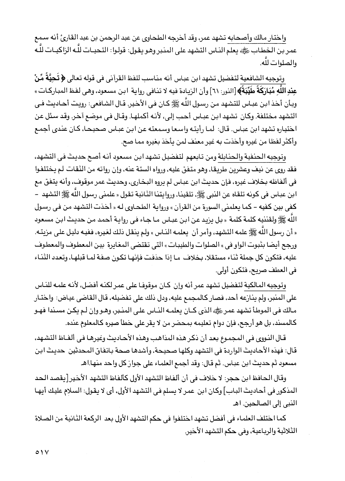وتوجيه الشافعية لتفضيل تشهد ابن عباس أنه مناسب للفظ القرآني في قوله تعالى {تحية من عند الله مباركة طيبة} [النور: 61] وأن الزيادة فيه لا تنافي رواية ابن مسعود، وهي لفظ المباركات" وبأن أخذ ابن عباس للتشهد من رسول الله صلى الله عليه وسلم كان في الأخير. قال الشافعي: رويت أحاديث في التشهد مختلفة. وكان تشهد ابن عباس أحب إلي، لأنه أكملها. وقال في موضع آخر. وقد سئل عن اختياره تشهد ابن عباس. قال: لما رأيته واسعا وسمعته عن ابن عباس صحيحا، كان عندي أجمع وأكثر لفظا من غيره وأخذت به غير معنف لمن يأخذ بغيره مما صح.