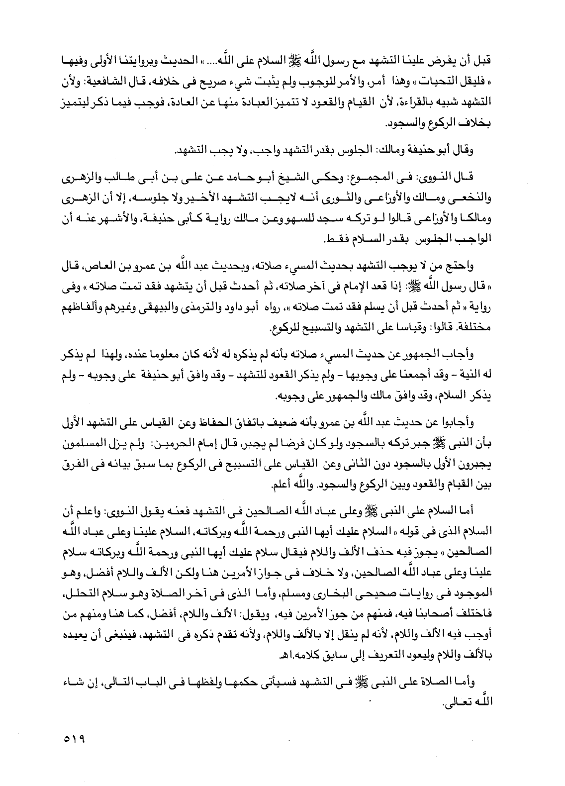 واحتج من لا يوجب التشهد بحديث المسيء صلاته، وبحديث عبد الله بن عمرو بن العاص، قال "قال رسول الله صلى الله عليه وسلم: إذا قعد الإمام في آخر صلاته، ثم أحدث قبل أن يتشهد فقد تمت صلاته" وفي رواية "ثم أحدث قبل أن يسلم فقد تمت صلاته"، رواه أبو داود والترمذي والبيهقي وغيرهم وألفاظهم مختلفة. قالوا: وقياسا على التشهد والتسبيح للركوع.