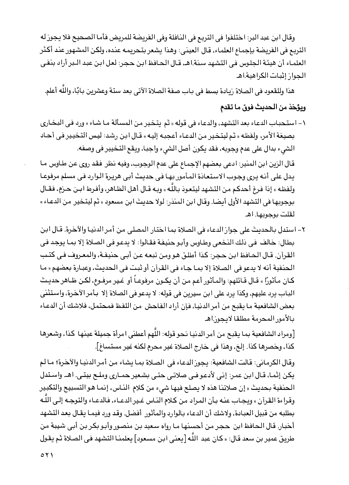 وقال الكرماني: قالت الشافعية: يجوز الدعاء في الصلاة بما يشاء من أمر الدنيا والآخرة؛ ما لم يكن إثما، قال ابن عمر: إني لأدعو في صلاتي حتى بشعير حماري وملح بيتي. اهـ. واستدل الحنفية بحديث "إن صلاتنا هذه لا يصلح فيها شيء من كلام الناس، إنما هو التسبيح والتكبير وقراءة القرآن" ويجاب عنه بأن المراد من كلام الناس غير الدعاء، فالدعاء والتوجه إلى الله بطلبه من قبيل العبادة، ولا شك أن الدعاء بالوارد والمأثور أفضل. وقد ورد فيما يقال بعد التشهد أخبار. قال الحافظ ابن حجر من أحسنها ما رواه سعيد بن منصور وأبو بكر بن أبي شيبة من طريق عمير بن سعد قال: "كان عبد الله [يعنى ابن مسعود] يعلمنا التشهد في الصلاة ثم يقول