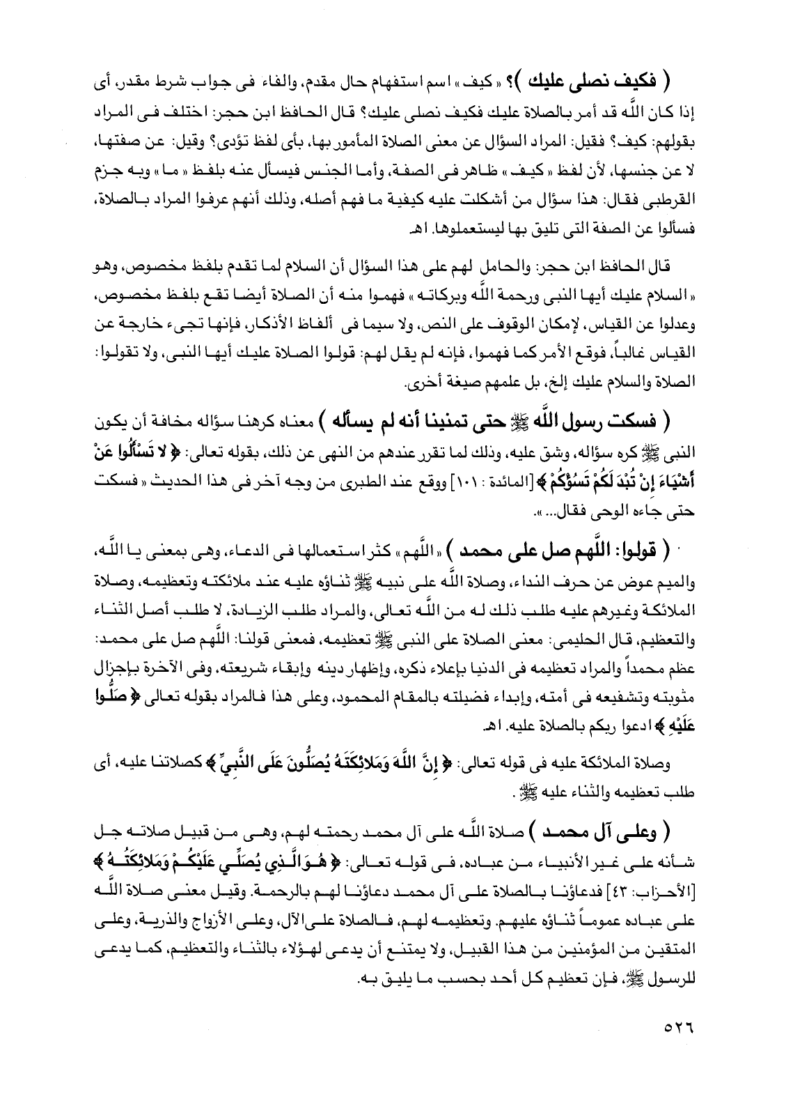 (فكيف نصلي عليك)؟ "كيف" اسم استفهام حال مقدم، والفاء في جواب شرط مقدر، أي إذا كان الله قد أمر بالصلاة عليك فكيف نصلي عليك؟ قال الحافظ ابن حجر: اختلف في المراد بقولهم: كيف؟ فقيل: المراد السؤال عن معنى الصلاة المأمور بها، بأي لفظ تؤدى؟ وقيل: عن صفتها، لا عن جنسها، لأن لفظ "كيف" ظاهر في الصفة، وأما الجنس فيسأل عنه بلفظ "ما" وبه جزم القرطبي فقال: هذا سؤال من أشكلت عليه كيفية ما فهم أصله، وذلك أنهم عرفوا المراد بالصلاة، فسألوا عن الصفة التي تلبق بها ليستعملوها. اهـ.