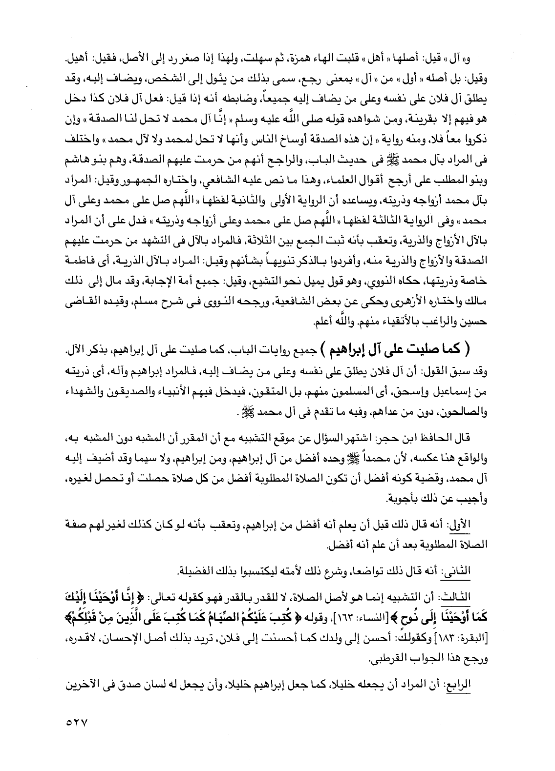 وقيل: بل أصله "أول" من "آل" بمعنى رجع، سمي بذلك من يئول إلى الشخص، ويضاف إليه، وقد يطلق آل فلان على نفسه وعلى من يضاف إليه جميعا، وضابطه أنه إذا قيل: فعل آل فلان كذا دخل هو فيهم إلا بقرينة، ومن شواهده قوله صلى الله عليه وسلم "إنا آل محمد لا تحل لنا الصدقة" وإن ذكروا معا فلا، ومنه رواية "إن هذه الصدقة أوساخ الناس وأنها لا تحل لمحمد ولا آل محمد" واختلف في المراد بآل محمد صلى الله عليه وسلم في حديث الباب، والراجح أنهم من حرمت عليهم الصدقة، وهم بنو هاشم وبنو المطلب على أرجح أقوال العلماء، وهذا ما نص عليه الشافعي، واختاره الجمهور وقيل: المراد بآل محمد أزواجه وذريته، ويساعده أن الرواية الأولى والثانية لفظها "اللهم صل على محمد وعلى آل محمد" وفي الرواية الثالثة لفظها "اللهم صل على محمد وعلى أزواجه وذريته" فدل على أن المراد بالآل الأزواج والذرية، وتعقب بأنه ثبت الجمع بين الثلاثة، فالمراد بالآل في التشهد من حرمت عليهم الصدقة والأزواج والذرية منه، وأفردوا بالذكر تنويها بشأنهم وقيل: المراد بالآل الذرية، أي فاطمة خاصة وذريتها، حكاه النووي، وهو قول يميل نحو التشيع، وقيل: جميع أمة الإجابة، وقد مال إلى ذلك مالك واختاره الأزهري وحكي عن بعض الشافعية، ورجحه النووي في شرح مسلم، وقيده القاضي حسين والراغب بالأتقياء منهم. والله أعلم.
