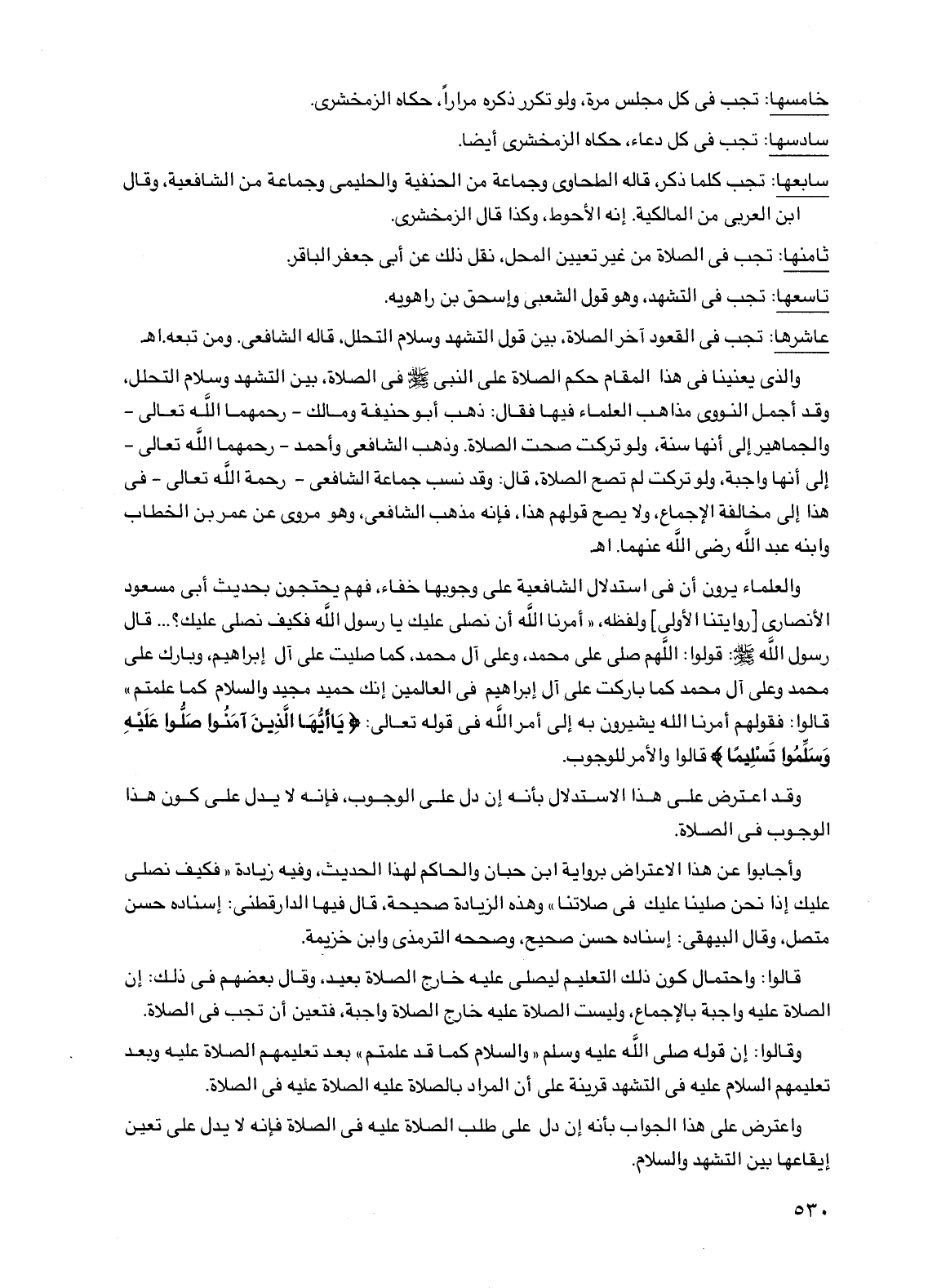 عاشرها: تجب في القعود آخر الصلاة، بين قول التشهد وسلام التحلل، قاله الشافعي. ومن تبعه. اهـ والذي يعنينا في هذا المقام حكم الصلاة على النبي صلى الله عليه وسلم في الصلاة، بين التشهد وسلام التحلل، وقد أجمل النووي مذاهب العلماء فيها فقال: ذهب أبو حنيفة ومالك -رحمهما الله تعالى- والجماهير إلى أنها سنة، ولو تركت صحت الصلاة. وذهب الشافعي وأحمد -رحمهما الله تعالى- إلى أنها واجبة، ولو تركت لم تصح الصلاة، قال: وقد نسب جماعة الشافعي -رحمه الله تعالى- في هذا إلى مخالفة الإجماع، ولا يصح قولهم هذا، فإنه مذهب الشافعي، وهو مروي عن عمر بن الخطاب وابنه عبد الله رضي الله عنهما. اهـ.