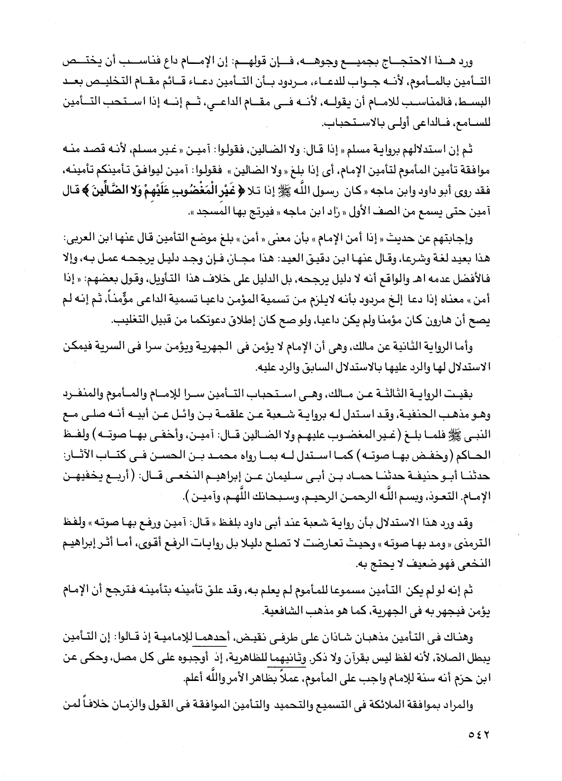 وإجابتهم عن حديث "إذا أمن الإمام" بأن معنى "أمن" بلغ موضع التأمين قال عنها ابن العربي: هذا بعيد لغة وشرعا، وقال عنها ابن دقيق العيد: هذا مجاز، فإن وجد دليل يرجحه عمل به، وإلا فالأفضل عدمه اهـ والواقع أنه لا دليل يرجحه، بل الدليل على خلاف هذا التأويل، وقول بعضهم: "إذا أمن" معناه إذا دعا إلخ مردود بأنه لا يلزم من تسمية المؤمن داعيا تسمية الداعي مؤمنا، ثم إنه لم يصح أن هارون كان مؤمنا ولم يكن داعيا، ولو صح كان إطلاق دعوتكما من قبيل التغليب.