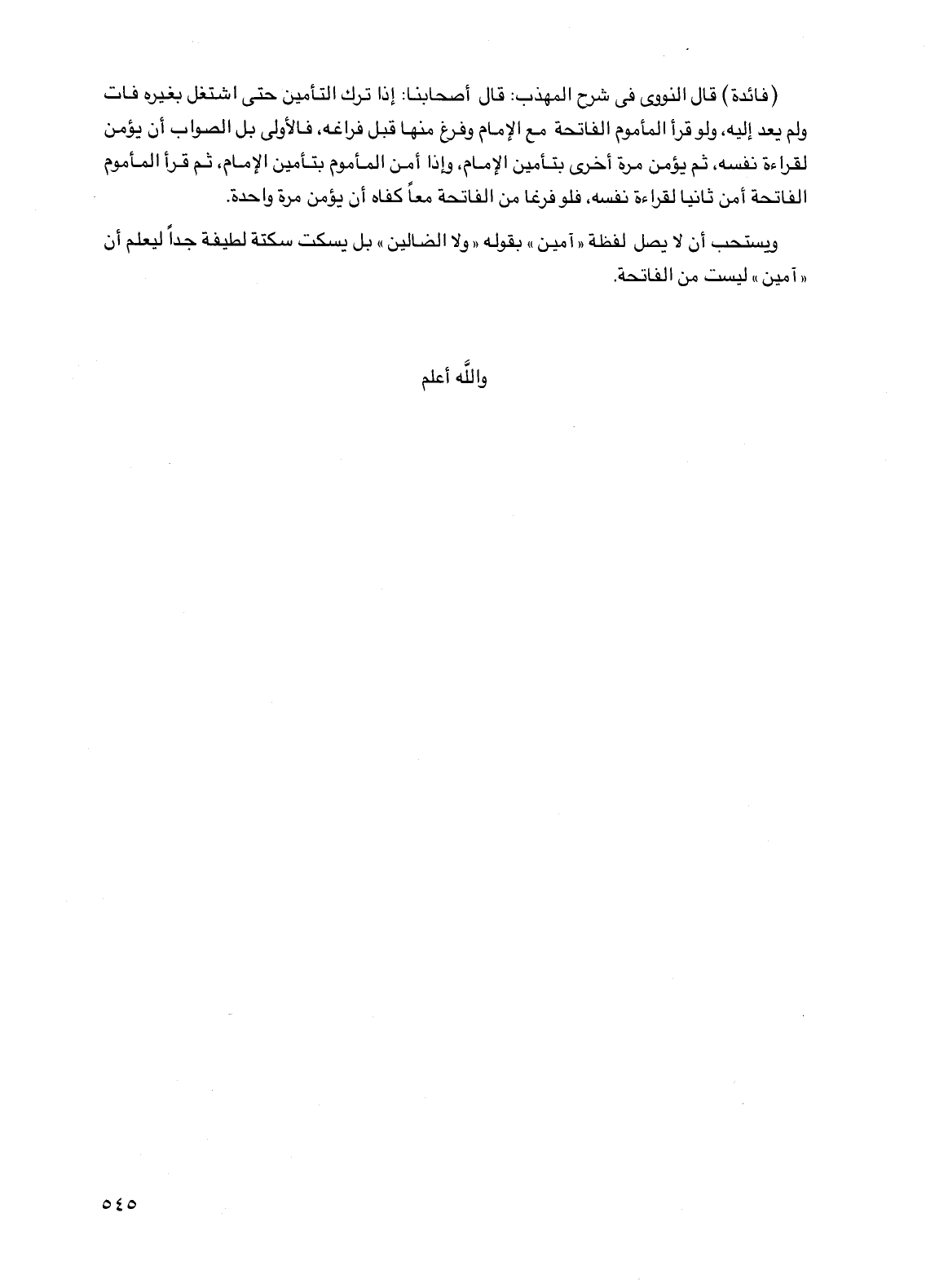 (فائدة) قال النووي في شرح المهذب: قال أصحابنا: إذا ترك التأمين حتى اشتغل بغيره فات ولم يعد إليه، ولو قرأ المأموم الفاتحة مع الإمام وفرغ منها قبل فراغه، فالأولى بل الصواب أن يؤمن لقراءة نفسه، ثم يؤمن مرة أخرى بتأمين الإمام، وإذا أمن المأموم بتأمين الإمام، ثم قرأ المأموم الفاتحة أمن ثانيا لقراءة نفسه، فلو فرغا من الفاتحة معا كفاه أن يؤمن مرة واحدة.