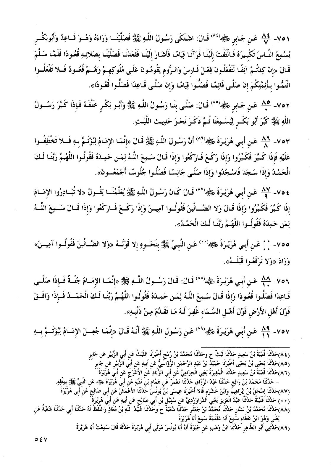 751 - عن جابر رضي الله عنه قال: اشتكى رسول الله صلى الله عليه وسلم فصلينا وراءه وهو قاعد وأبو بكر يسمع الناس تكبيره فالتفت إلينا فرآنا قياما فأشار إلينا فقعدنا فصلينا بصلاته قعودا فلما سلم قال "إن كدتم آنفا لتفعلون فعل فارس والروم يقومون على ملوكهم وهم قعود فلا تفعلوا ائتموا بأئمتكم إن صلى قائما فصلوا قياما وإن صلى قاعدا فصلوا قعودا".