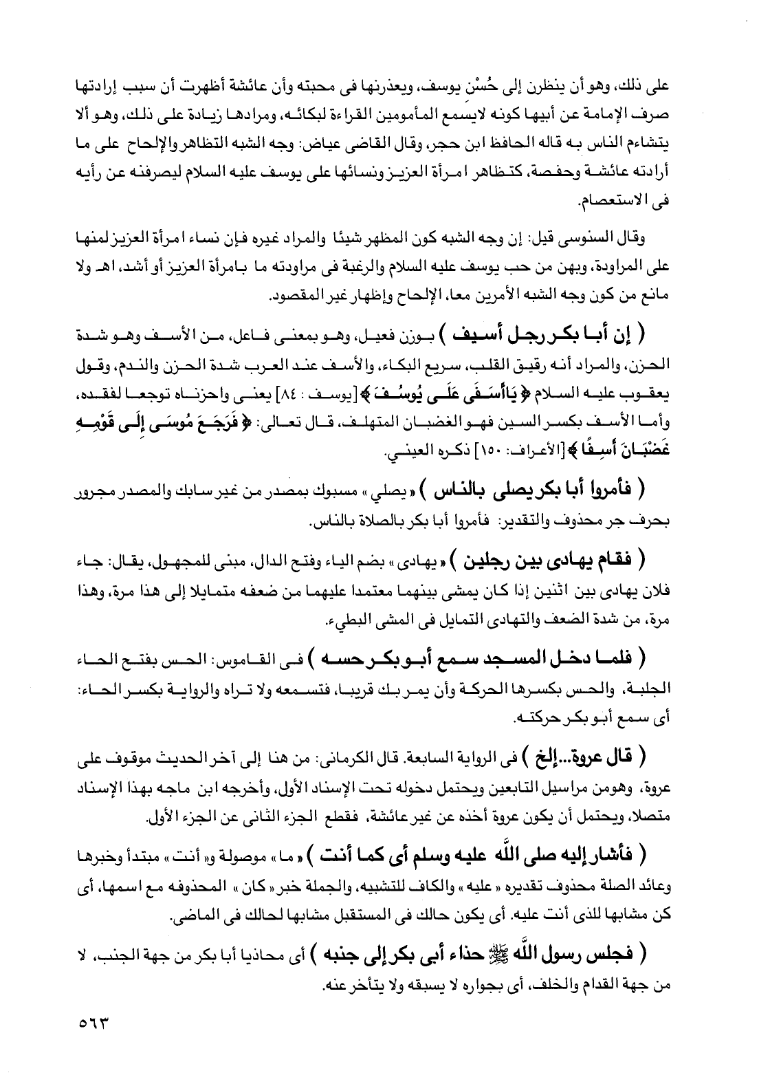 على ذلك، وهو أن ينظرن إلى حسن يوسف، ويعذرنها في محبته وأن عائشة أظهرت أن سبب إرادتها صرف الإمامة عن أبيها كونه لا يسمع المأمومين القراءة لبكائه، ومرادها زيادة على ذلك، وهو ألا يتشاءم الناس به قاله الحافظ ابن حجر، وقال القاضي عياض: وجه الشبه التظاهر والإلحاح على ما أرادته عائشة وحفصة، كتظاهر امرأة العزيز ونسائها على يوسف عليه السلام ليصرفنه عن رأيه في الاستعصام.