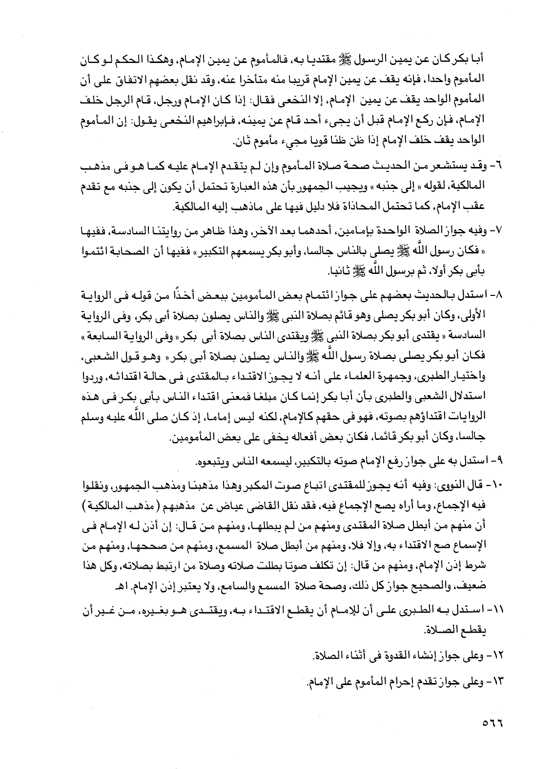 6 - وقد يستشعر من الحديث صحة صلاة المأموم وإن لم يتقدم الإمام عليه كما هو في مذهب المالكية، لقوله "إلى جنبه" ويجيب الجمهور بأن هذه العبارة تحتمل أن يكون إلى جنبه مع تقدم عقب الإمام، كما تحتمل المحاذاة فلا دليل فيها على ما ذهب إليه المالكية.