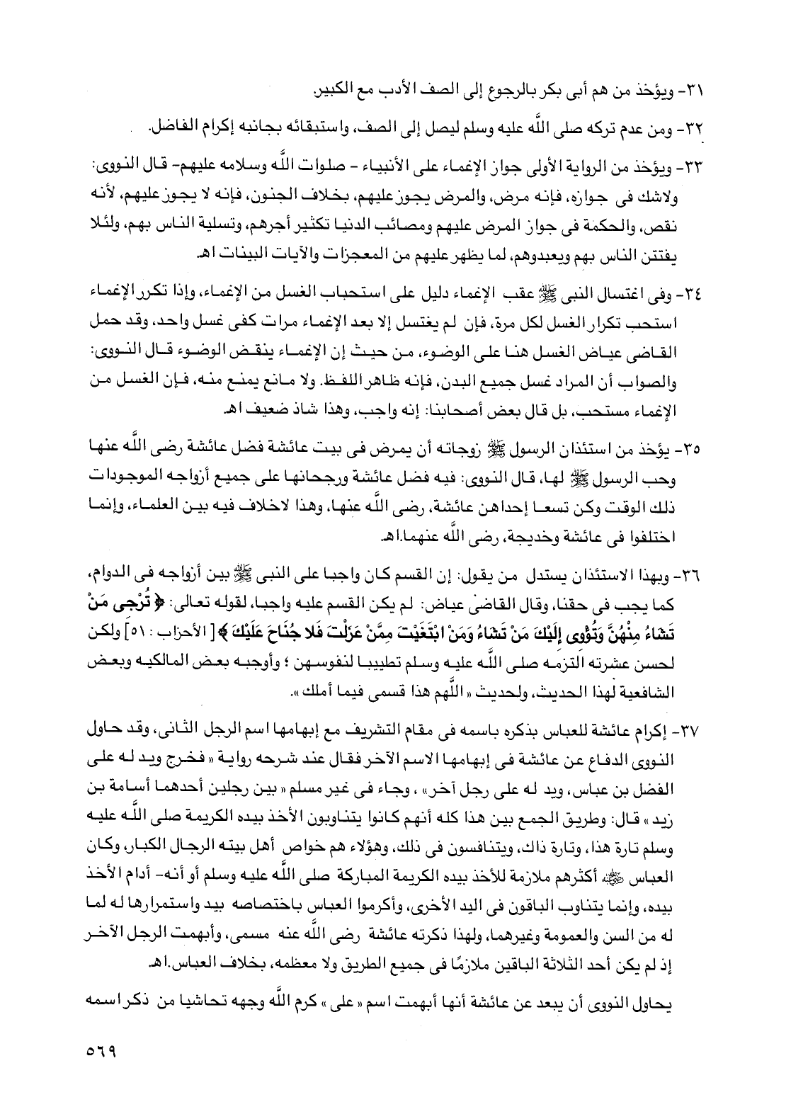 33 - ويؤخذ من الرواية الأولى جواز الإغماء على الأنبياء -صلوات الله وسلامه عليهم- قال النووي: ولا شك في جوازه، فإنه مرض، والمرض يجوز عليهم، بخلاف الجنون، فإنه لا يجوز عليهم، لأنه نقص، والحكمة في جواز المرض عليهم ومصائب الدنيا تكثير أجرهم، وتسلية الناس بهم، ولئلا يفتتن الناس بهم ويعبدوهم، لما يظهر عليهم من المعجزات والآيات البينات. اهـ.