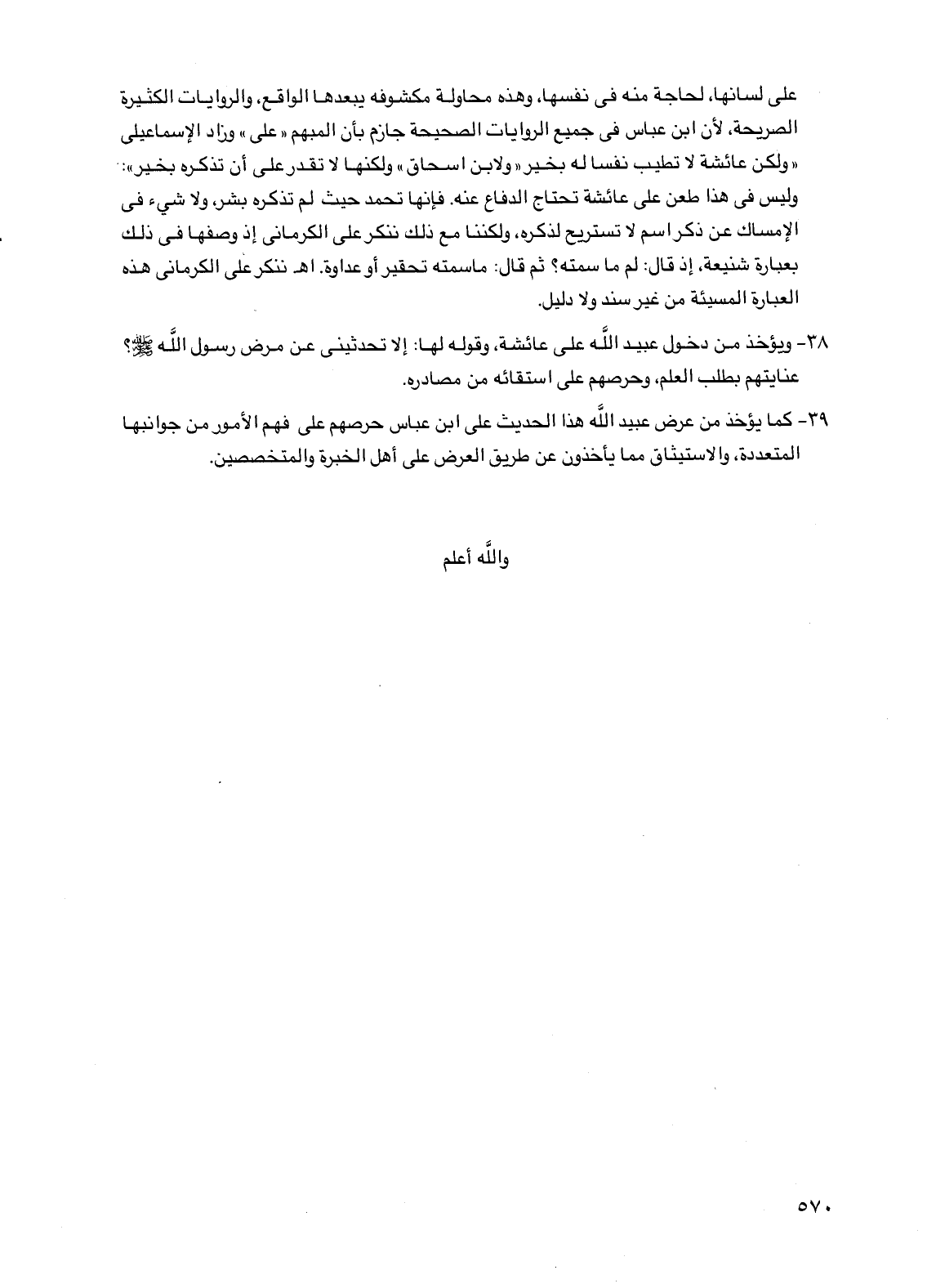 على لسانها، لحاجة منه في نفسها، وهذه محاولة مكشوفه يبعدها الواقع، والروايات الكثيرة الصريحة، لأن ابن عباس في جميع الروايات الصحيحة جازم بأن المبهم "علي" وزاد الإسماعيلي "ولكن عائشة لا تطيب نفسا له بخير" ولابن إسحاق" ولكنها لا تقدر على أن تذكره بخير": وليس في هذا طعن على عائشة تحتاج الدفاع عنه. فإنها تحمد حيث لم تذكره بشر، ولا شيء في الإمساك عن ذكر اسم لا تستريح لذكره، ولكننا مع ذلك ننكر على الكرماني إذ وصفها في ذلك بعبارة شنيعة، إذ قال: لم ما سمته؟ ثم قال: ما سمته تحقير أو عداوة. اهـ. ننكر على الكرماني هذه العبارة المسيئة من غير سند ولا دليل.