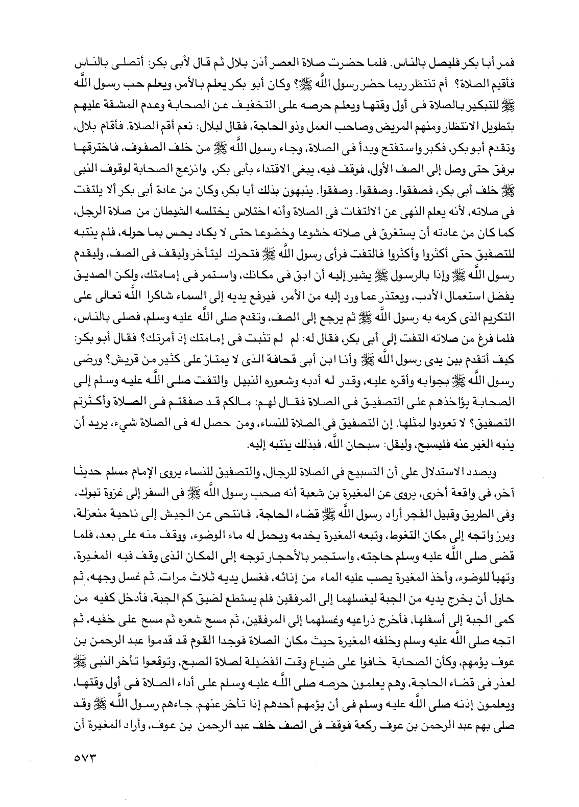 وبصدد الاستدلال على أن التسبيح في الصلاة للرجال، والتصفيق للنساء يروي الإمام مسلم حديثا آخر، في واقعة أخرى، يروي عن المغيرة بن شعبة أنه صحب رسول الله صلى الله عليه وسلم في السفر إلى غزوة تبوك، وفي الطريق وقبيل الفجر أراد رسول الله صلى الله عليه وسلم قضاء الحاجة، فانتحى عن الجيش إلى ناحية منعزلة، وبرز واتجه إلى مكان التغوط، وتبعه المغيرة يخدمه ويحمل له ماء الوضوء، ووقف منه على بعد، فلما قضى صلى الله عليه وسلم حاجته، واستجمر بالأحجار توجه إلى المكان الذي وقف فيه المغيرة، وتهيأ للوضوء، وأخذ المغيرة يصب عليه الماء من إنائه، فغسل يديه ثلاث مرات. ثم غسل وجهه، ثم حاول أن يخرج يديه من الجبة ليغسلهما إلى المرفقين فلم يستطع لضيق كم الجبة، فأدخل كفيه من كمي الجبة إلى أسفلها، فأخرج ذراعيه وغسلهما إلى المرفقين، ثم مسح شعره ثم مسح على خفيه، ثم اتجه صلى الله عليه وسلم وخلفه المغيرة حيث مكان الصلاة فوجدا القوم قد قدموا عبد الرحمن بن عوف يؤمهم، وكأن الصحابة خافوا على ضياع وقت الفضيلة لصلاة الصبح، وتوقعوا تأخر النبي صلى الله عليه وسلم لعذر في قضاء الحاجة، وهم يعلمون حرصه صلى الله عليه وسلم على أداء الصلاة في أول وقتها، ويعلمون إذنه صلى الله عليه وسلم في أن يؤمهم أحدهم إذا تأخر عنهم.