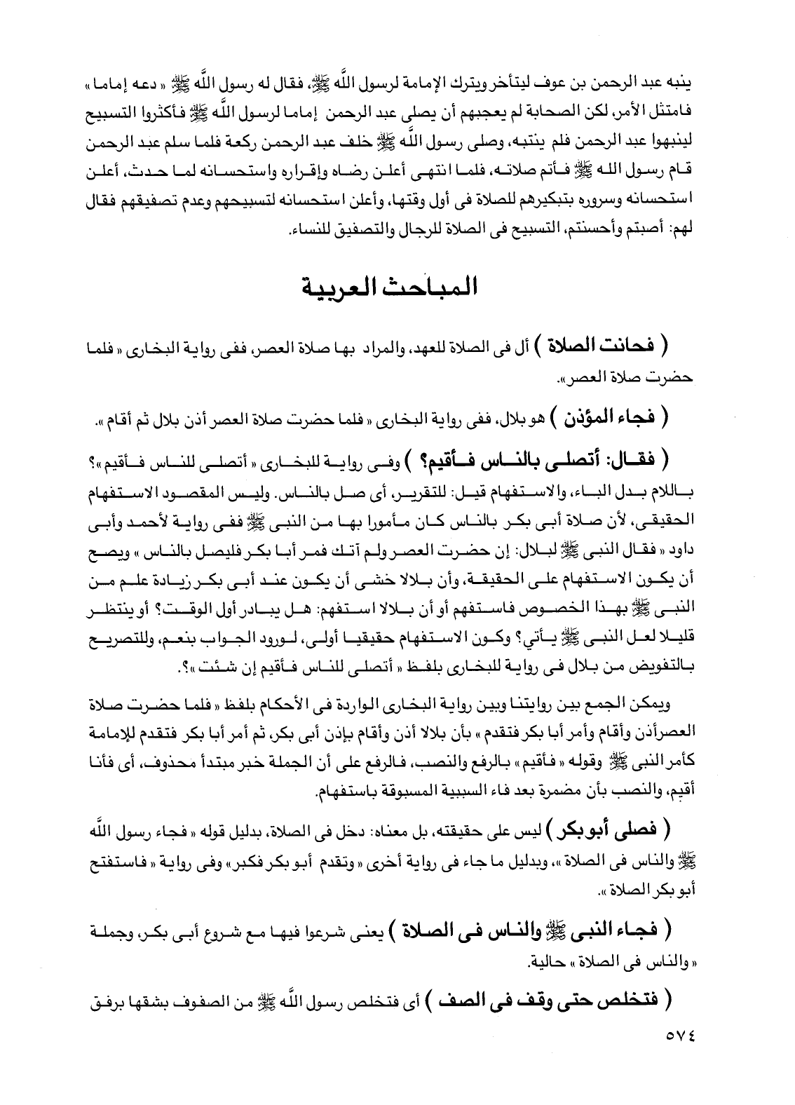 ينبه عبد الرحمن بن عوف ليتأخر ويترك الإمامة لرسول الله صلى الله عليه وسلم، فقال له رسول الله صلى الله عليه وسلم "دعه إماما" فامتثل الأمر، لكن الصحابة لم يعجبهم أن يصلي عبد الرحمن إماما لرسول الله صلى الله عليه وسلم فأكثروا التسبيح لينبهوا عبد الرحمن فلم ينتبه، وصلى رسول الله صلى الله عليه وسلم خلف عبد الرحمن ركعة فلما سلم عبد الرحمن قام رسول الله صلى الله عليه وسلم فأتم صلاته، فلما انتهى أعلن رضاه وإقراره واستحسانه لما حدث، أعلن استحسانه وسروره بتبكيرهم للصلاة في أول وقتها، وأعلن استحسانه لتسبيحهم وعدم تصفيقهم فقال لهم: أصبتم وأحسنتم، التسبيح في الصلاة للرجال والتصفيق للنساء.