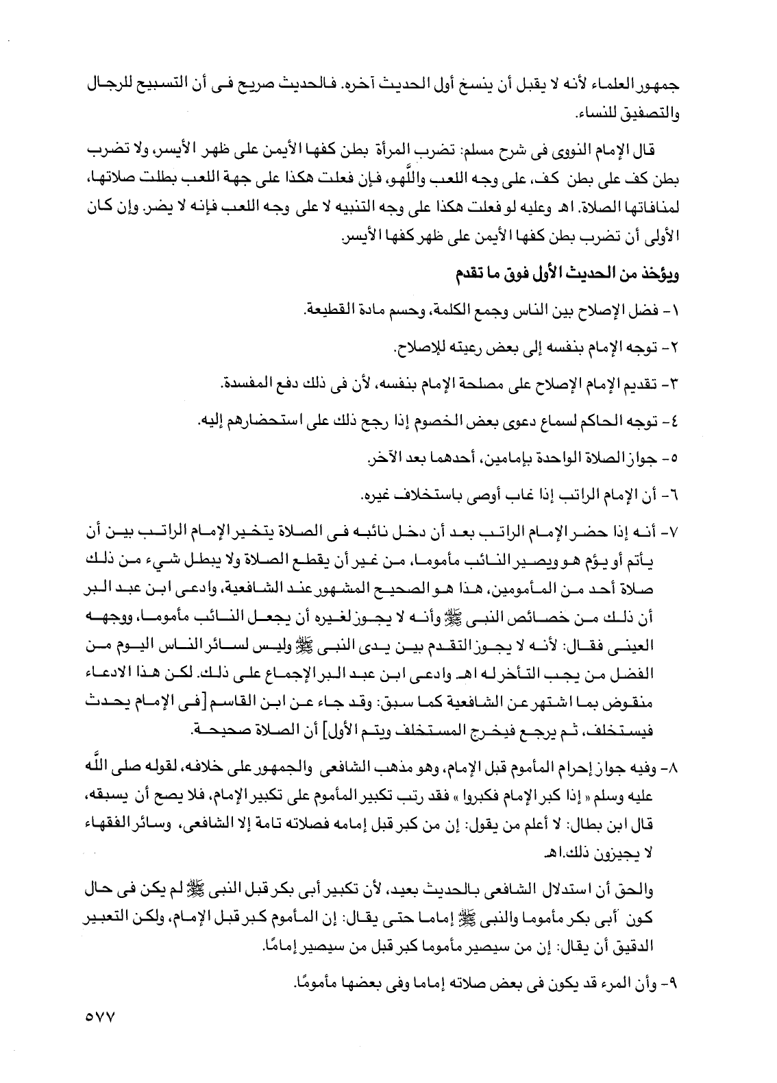 7 - أنه إذا حضر الإمام الراتب بعد أن دخل نائبه في الصلاة يتخير الإمام الراتب بين أن يأتم أو يؤم هو ويصير النائب مأموما، من غير أن يقطع الصلاة ولا يبطل شيء من ذلك صلاة أحد من المأمومين، هذا هو الصحيح المشهور عند الشافعية، وادعى ابن عبد البر أن ذلك من خصائص النبي صلى الله عليه وسلم وأنه لا يجوز لغيره أن يجعل النائب مأموما، ووجهه العيني فقال: لأنه لا يجوز التقدم بين يدي النبي صلى الله عليه وسلم وليس لسائر الناس اليوم من الفضل من يجب التأخر له اهـ وادعى ابن عبد البر الإجماع على ذلك. لكن هذا الادعاء منقوض بما اشتهر عن الشافعية كما سبق: وقد جاء عن ابن القاسم [في الإمام يحدث فيستخلف، ثم يرجع فيخرج المستخلف ويتم الأول] أن الصلاة صحيحة.